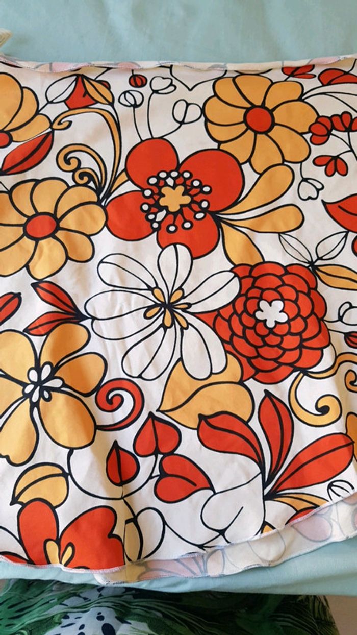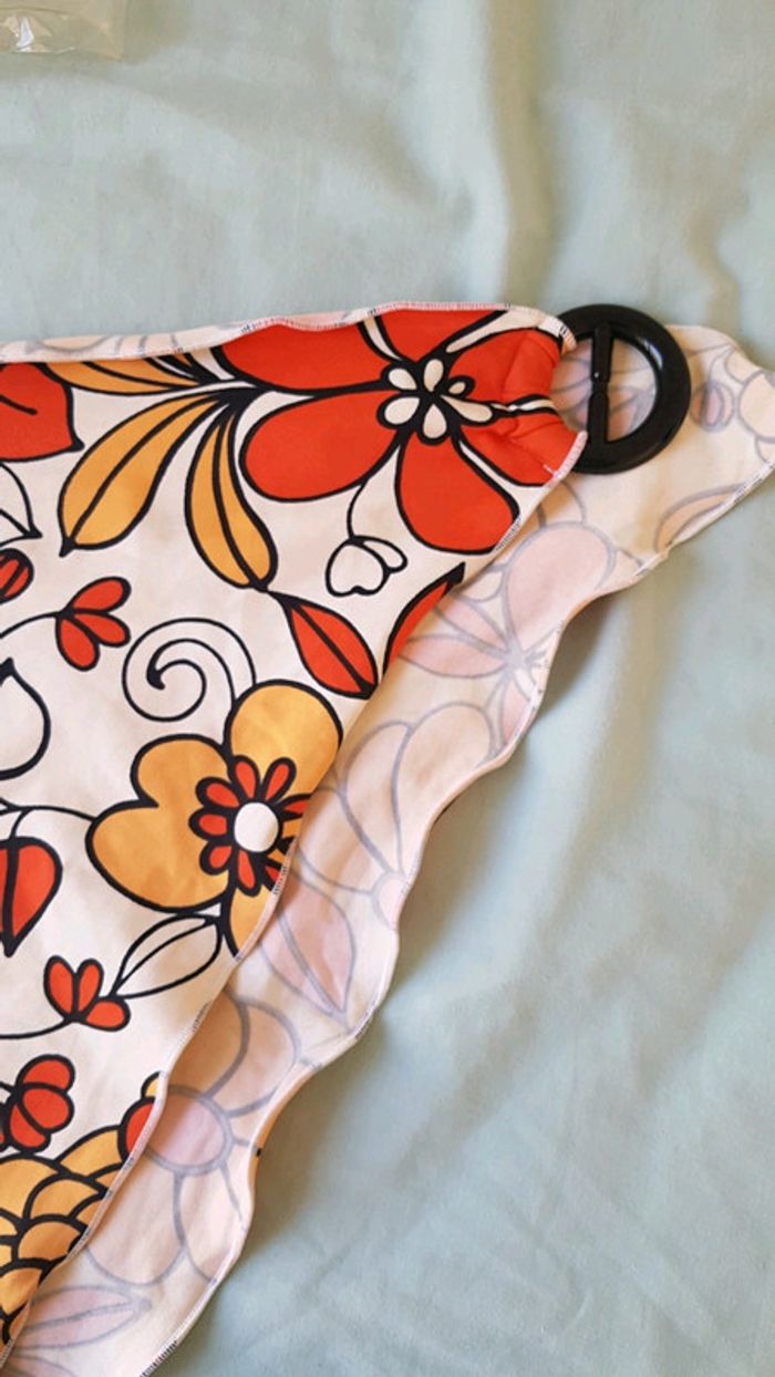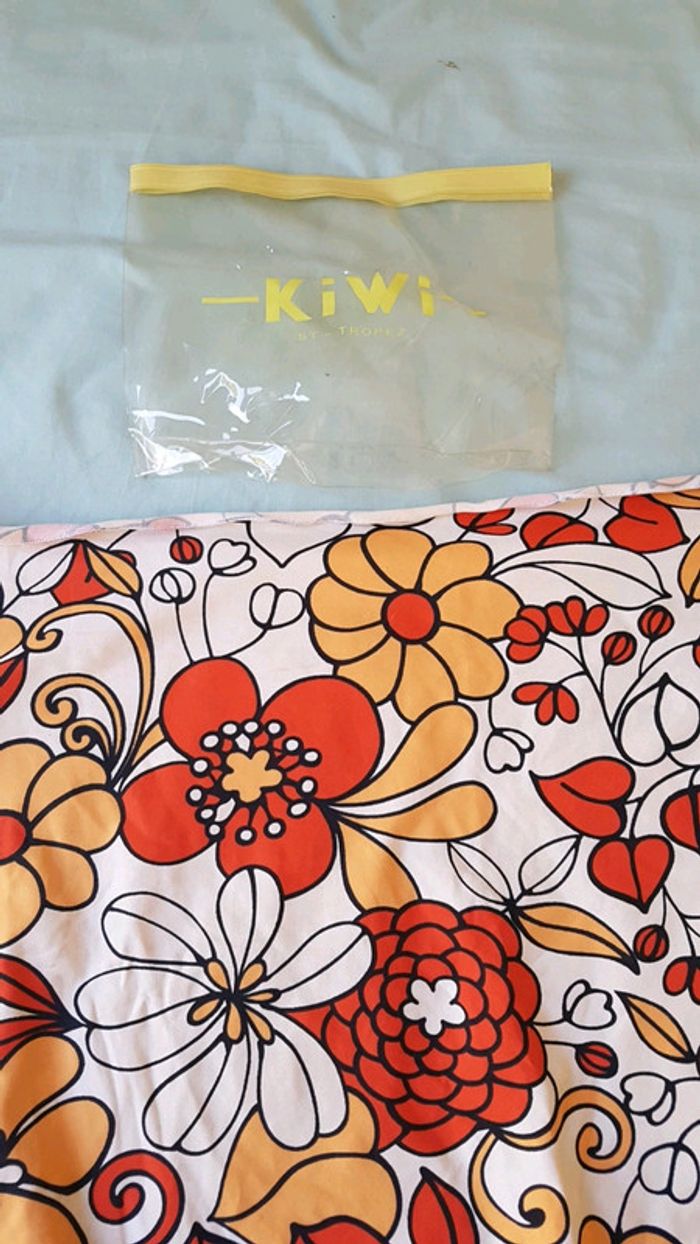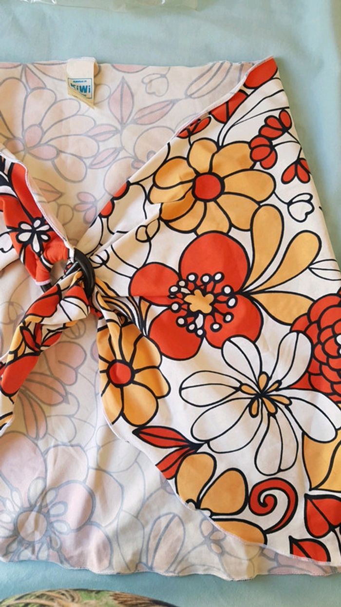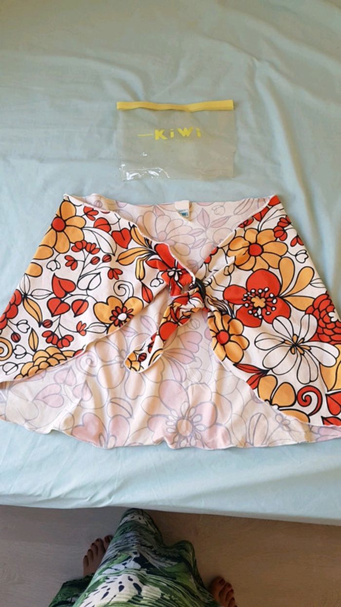 Paréo qui s'attache autour de la taille grâce à une boucle. Matière maillot de bain. Motif fleuri. Marque kiwi saint Tropez. Très bon état