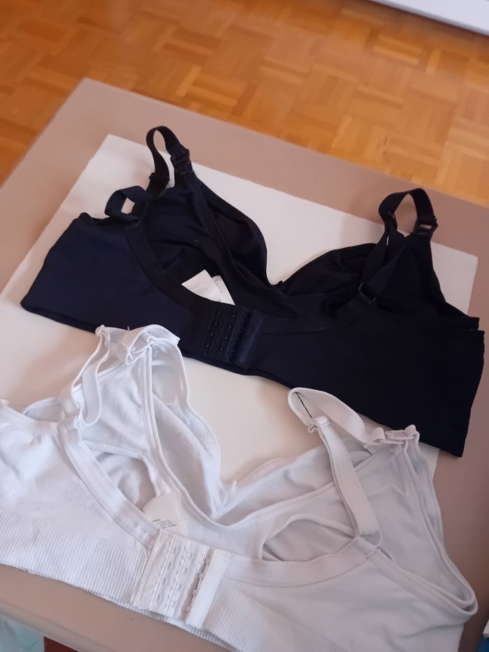 Lot de 2 Brassière d'allaitement Une blanche l'autre noir Acheter en août 2023 peut porter la forme ne me convient pas La blanche c'est abîmée plus que la noir (voir photo) Ouverture par clips devant Fermeture arrière 4 agrafes T4 - Marque premaman orchestra