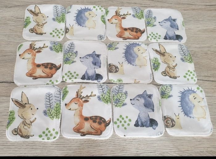 Voici un lot de 12 lingettes lavables Ces lingettes sont douces, idéales pour la toilette de bébé. Ou le soins du visage de maman. Un côté coton Oeko-Tex, sur le thème des animaux de la forêt. Un côté éponge ecrue en Bambou trés douce pour les fesses de bébé ou le visage. Dimensions : environ 9cm sur 10cm. Lavable en machine jusqu'à 40 degrés, sèche linge doux. Pour plus de renseignements me contacter.