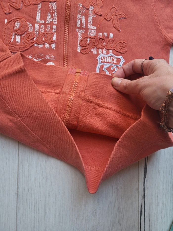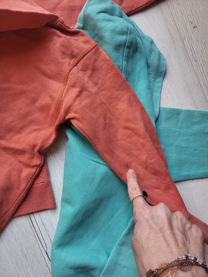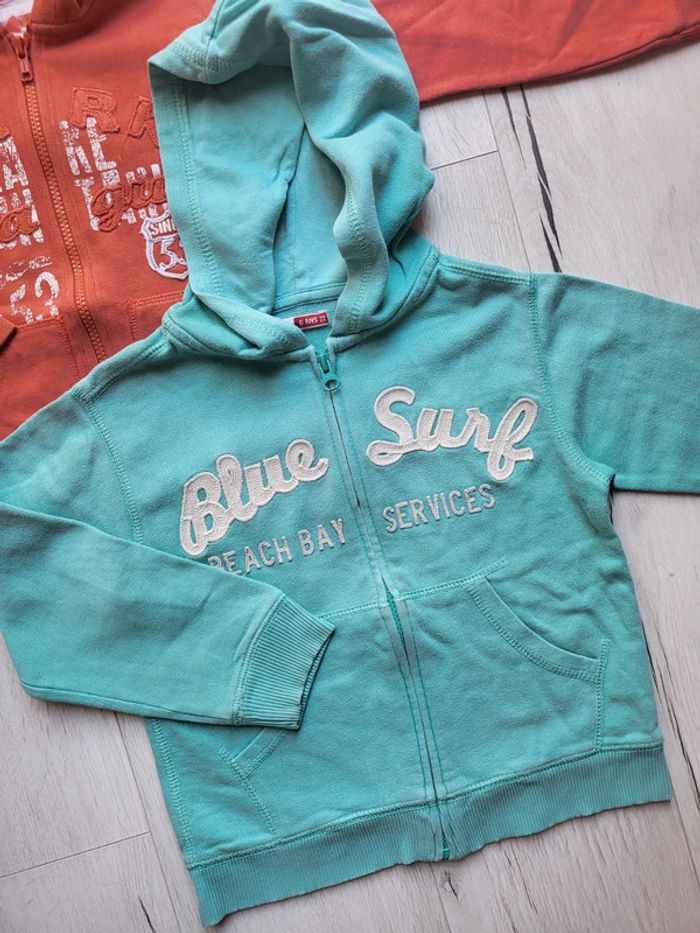 Lot de 2 gilets zippés à capuche. Taille 6 ans. Un turquoise dpam Un orange tissaia je crois (minis tâches à signaler cf.photos). Très sympa portés. #6anstristan #gilets #6ans #giletszippés #dpam #tissaia #turquoise