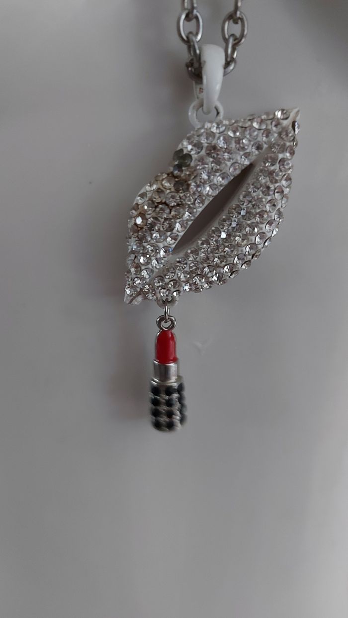 Collier argenté réglable L 64 cm Pendentif bouche, manque strass