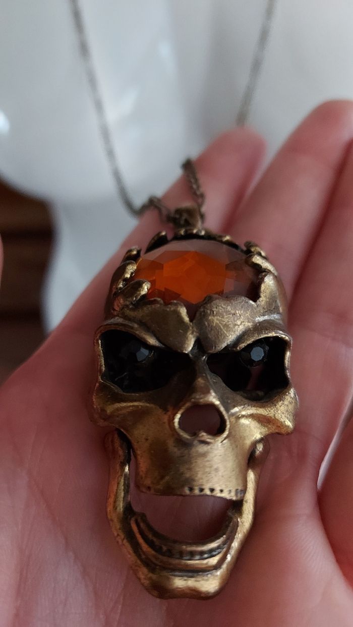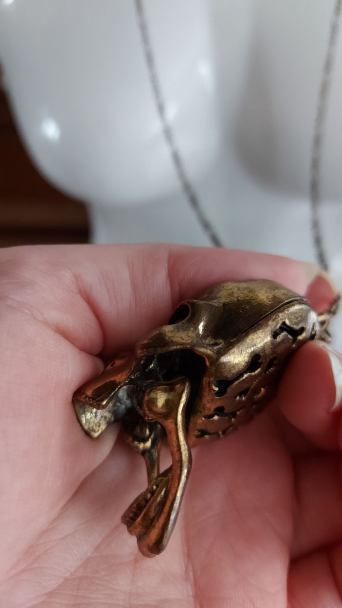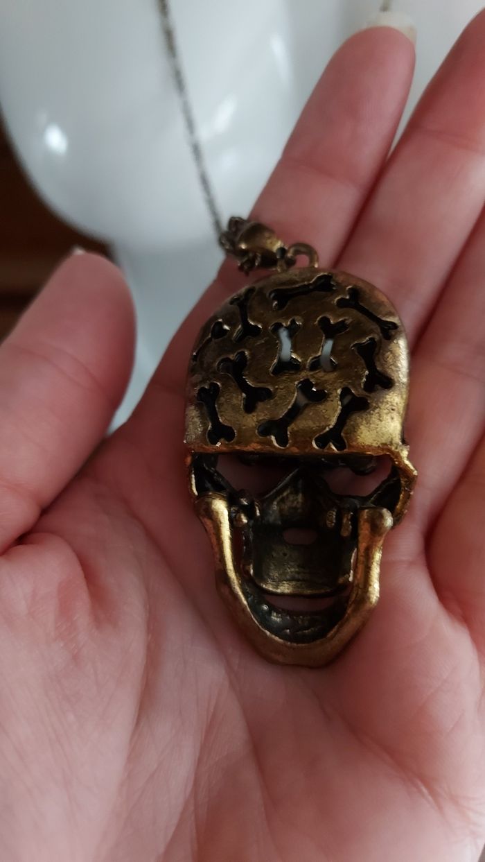 Collier doré (noirci) L 82 cm Pendentif tête de mort, mâchoire articulée