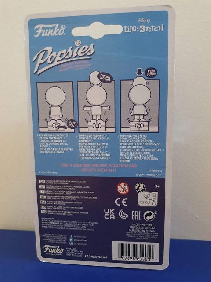 Figurine Funko Popsies Stitch en vinyle, non déballée. Lorsque vous appuyez sur le bouton du ruban du cadeau, Stitch va lever les bras et une bulle avec un message apparait au dessus de sa tête. #Stitch
