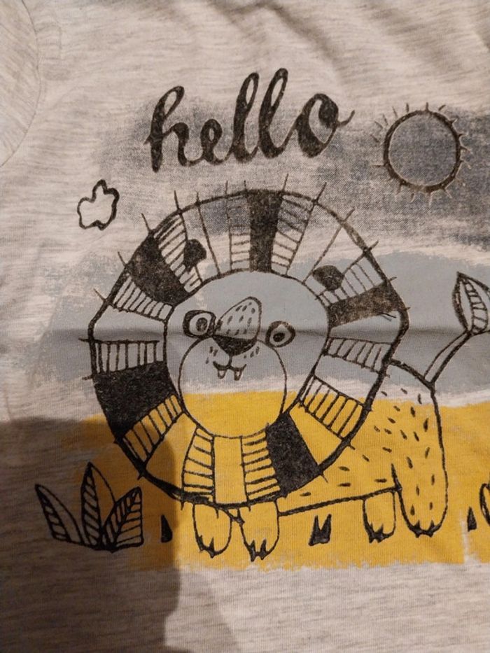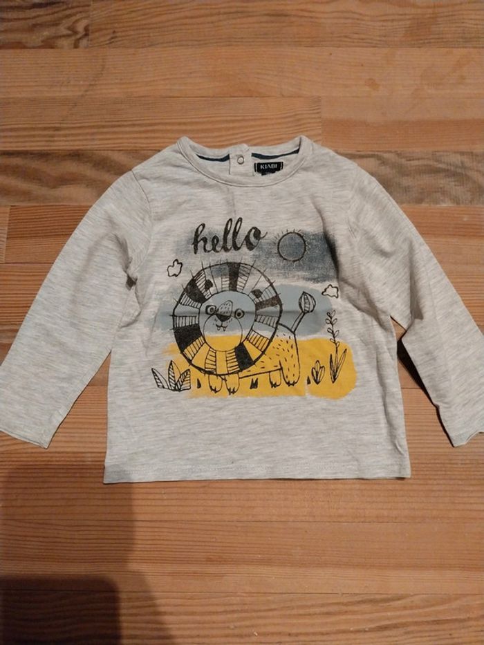T-shirt manches longue "hello" avec un lion. Dessin légèrement en relief (velours). Bon état. #mariesouc_garçon24mois #mariesouc_kiabi