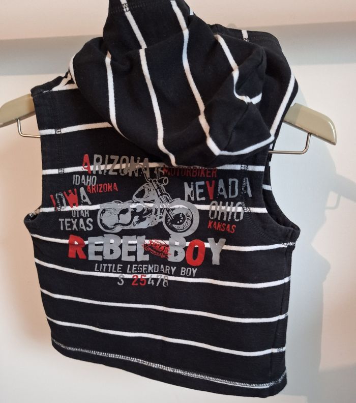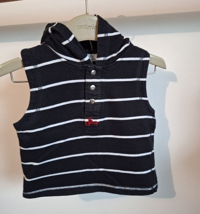 GARÇON 18 MOIS N°813 sweta sans manche , capuche Pression col Rayé noir , blanc Taille 18 mois Kimbaloo 1,50€ #kelly_garçon18mois