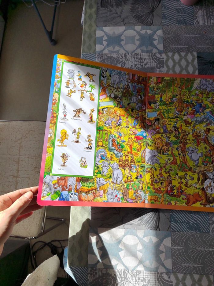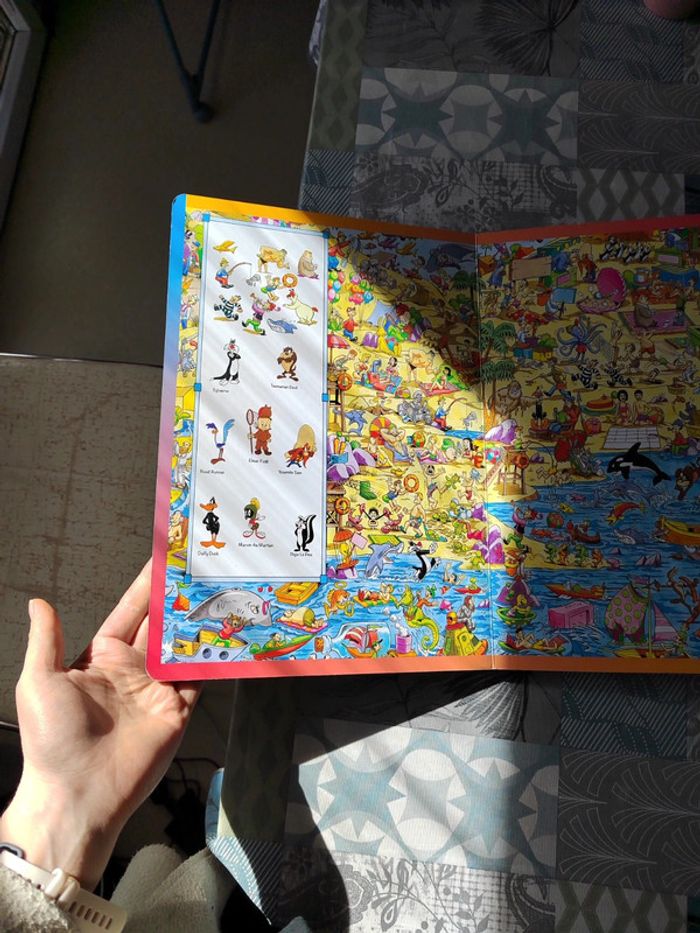 Livre cartonné où il faut retrouver les personnages Looney Tunes dans une scène. Très bon état.