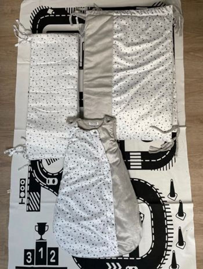 🐰 Lot composé d’un tour de lit 190x23cm idéal quand le lit est en position haute, d’un tour de lit 180x40cm et d’une gigoteuse taille 65cm de la marque Kinousses. 🐰 Les tours de lit sont comme neufs car très peu utilisés. La gigoteuse est neuve.