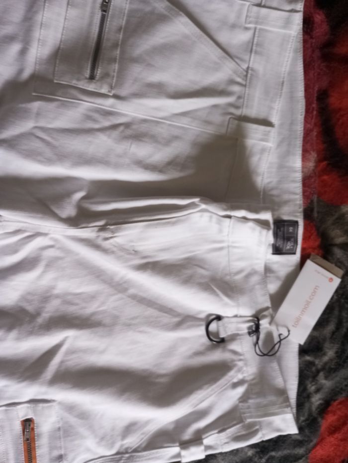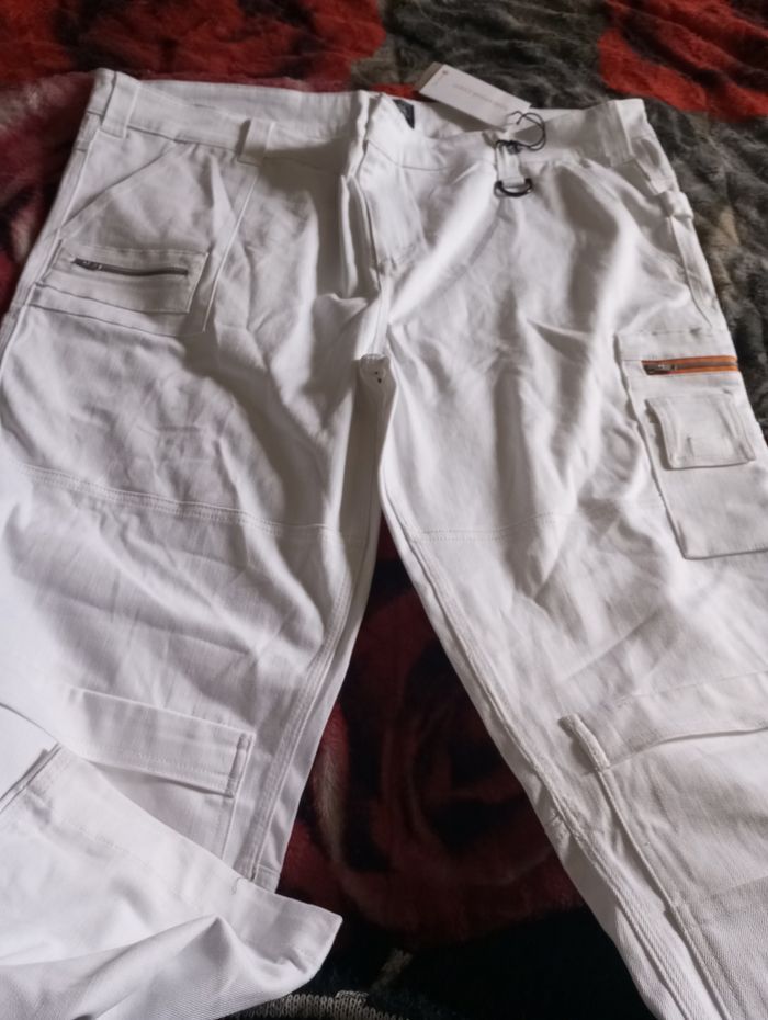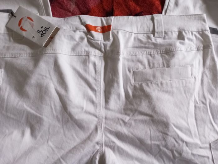 Pantalon femme taille 64 couleur blanc et un peu orange une poches sur chaque jambe matière très agréable très jolie