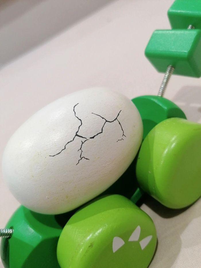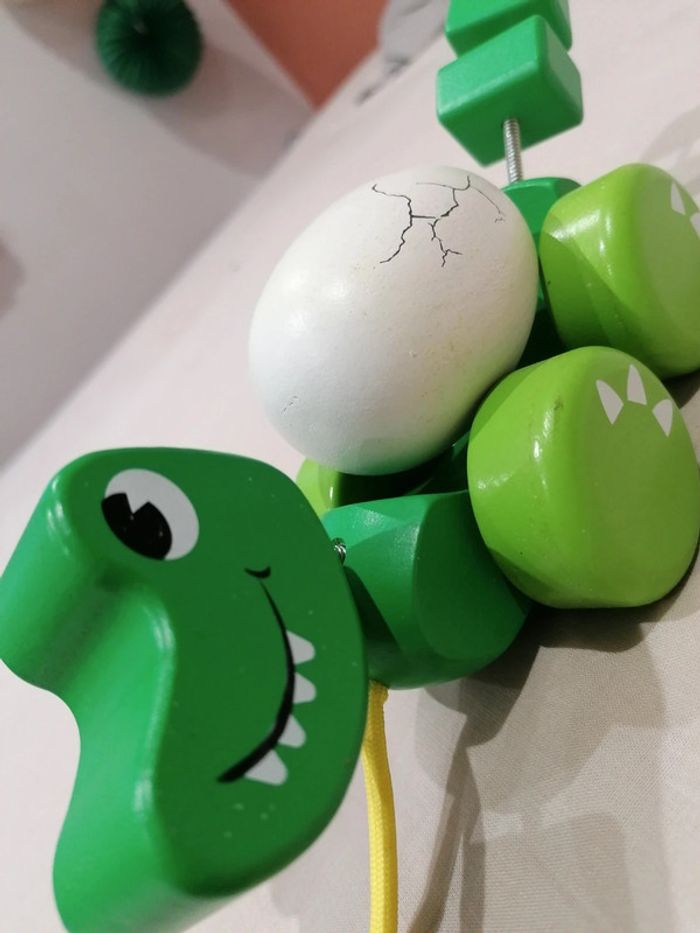 Crocodile à tirer, œuf qui roule sur le dos avec le roulement des roues. Effet cassure, éclosion de l'œuf.