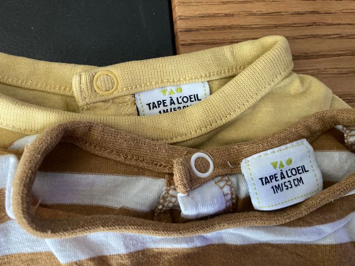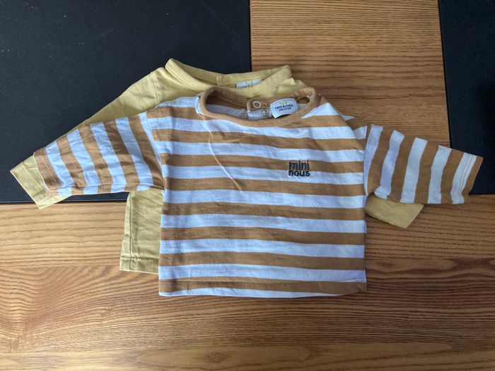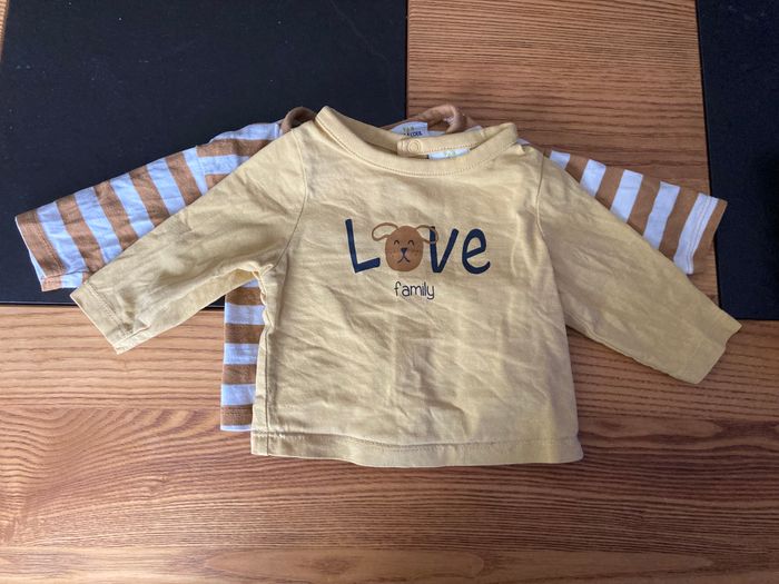 lot 2 tshirt manches longues un rayé marron et blanc avec broderie "mini nous" sur le coeur un jaune "Love family" avec tête de chien Marque : Tape à l'Oeil taille : 1 mois