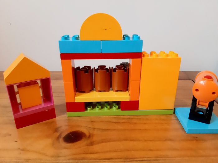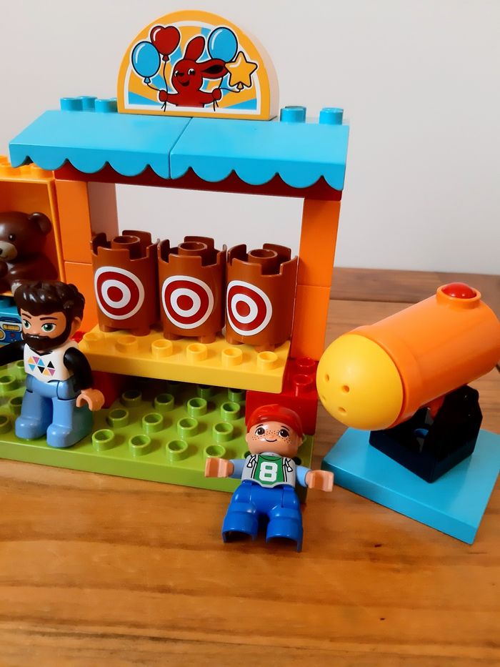 Lego duplo Le stand de tir de 2 à 5 ans : stand avec 3 blocs de cible, un lanceur avec 2 projectiles, stand de boisson, 2 personnages et accessoires. Ensemble complet, sans la boîte, ni instructions de montage que vous pouvez retrouver sur le site Lego.