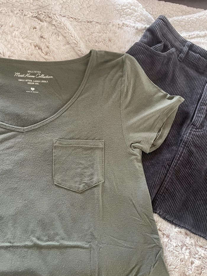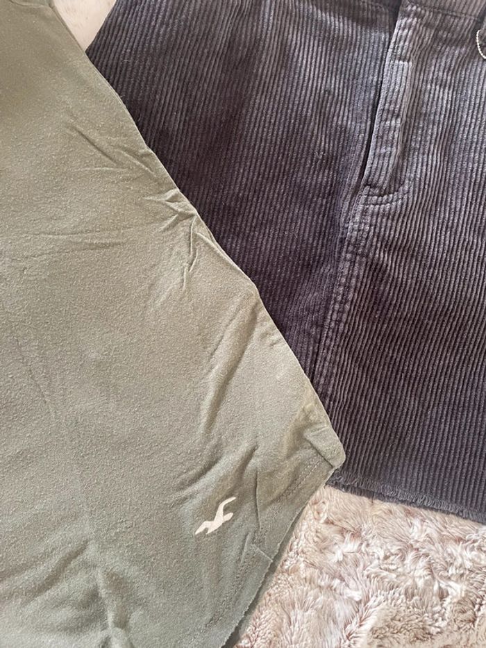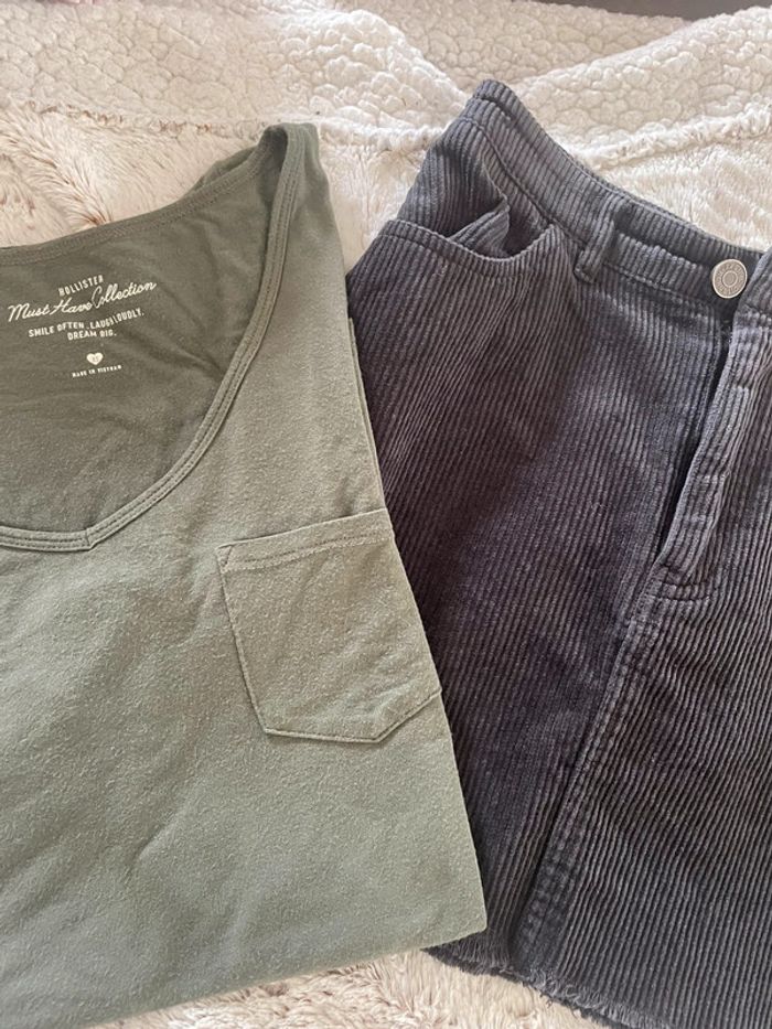 Haut kaki de marque hollister en très bon état prix à l’unité 10 euros haut taille S Jupe imitation daim en très bon état de la marque pull and bear prix à l’unité 10€ jupe taille XS Prix du lot 17€