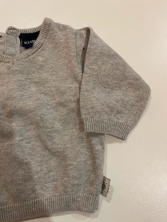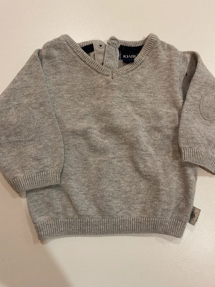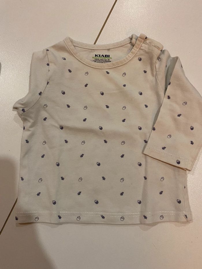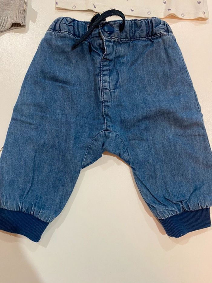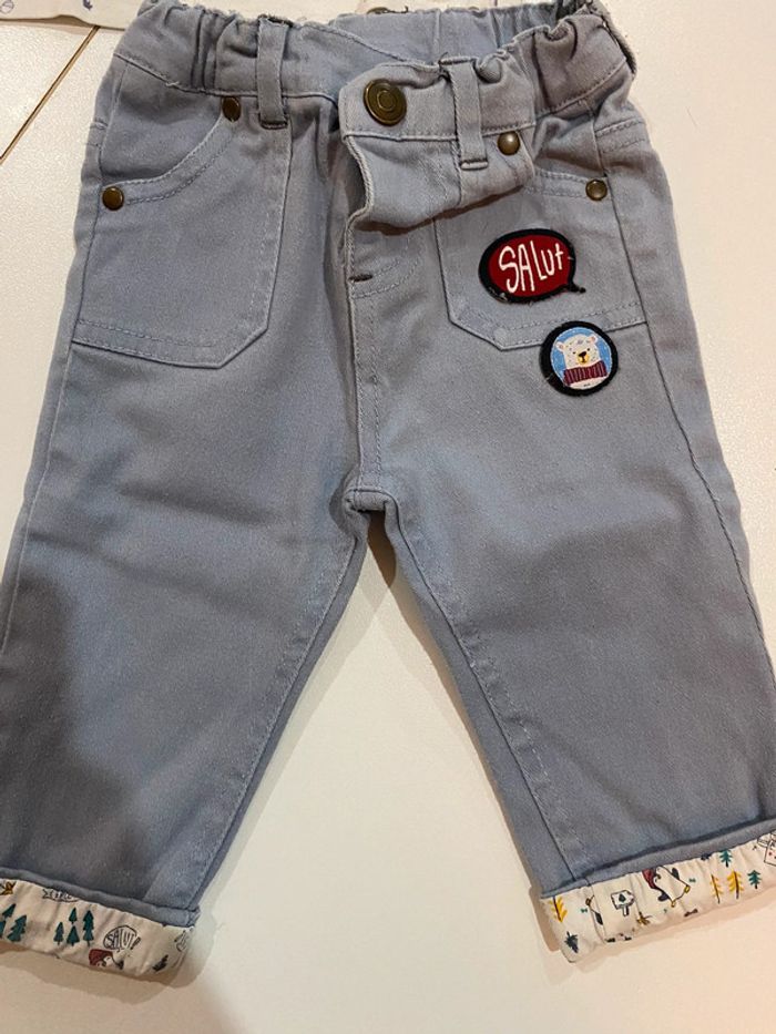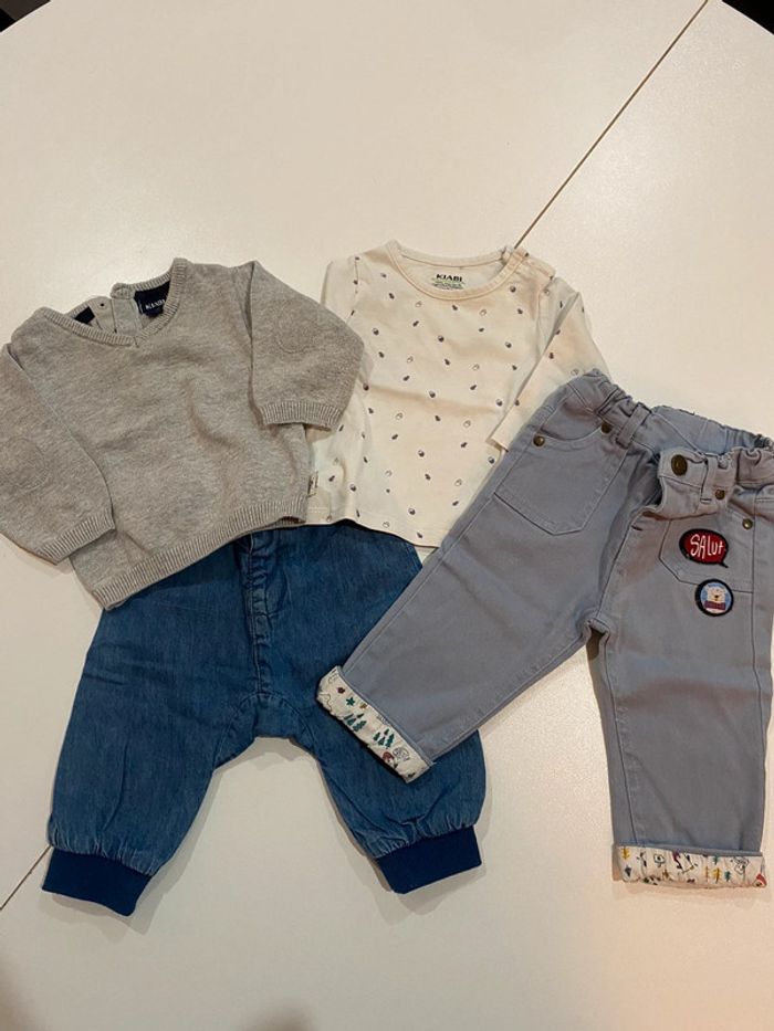 Lot garçons une tenue en 3 mois et un pantalon en 6 mois, l’ensemble est de marque Kiabi et le pantalon en 6 mois