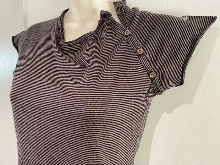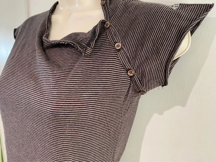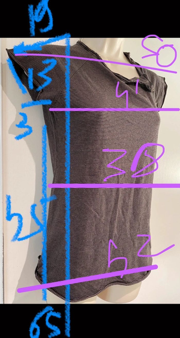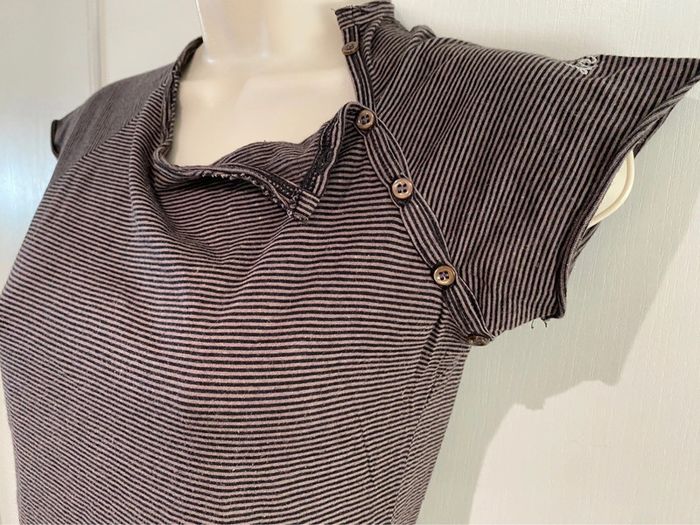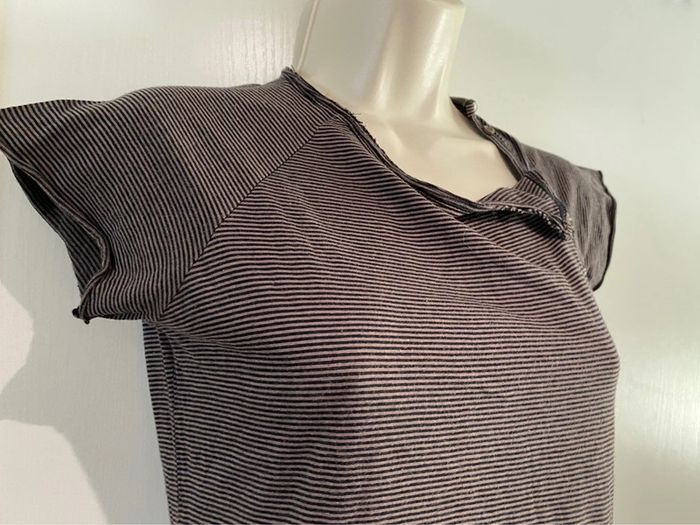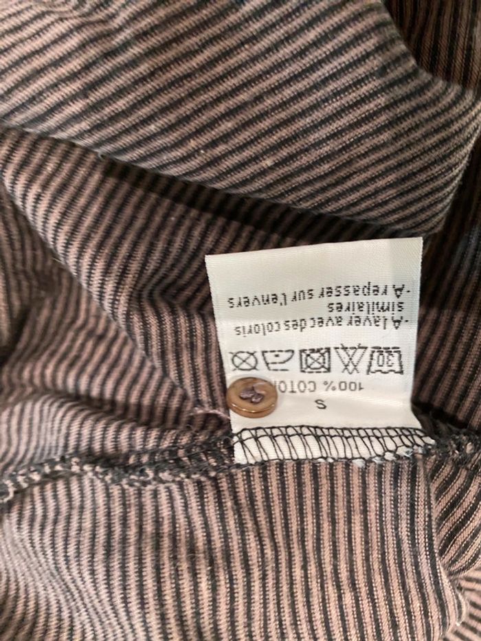 Je vends un T-shirt Il est en très bon état. Taille SA la ligne il est en coton 100 % T-shirt taille S. 100 % coton Bizzbee. Style Marin Il y a des petites pattes sur chaque côté dans le bas. Il est marron et noire Cho 90 oran22