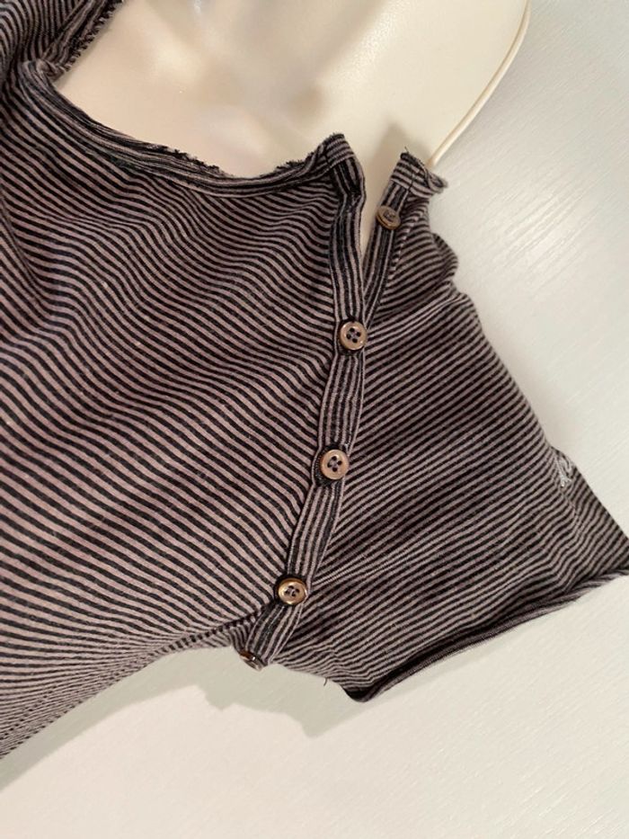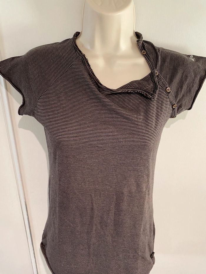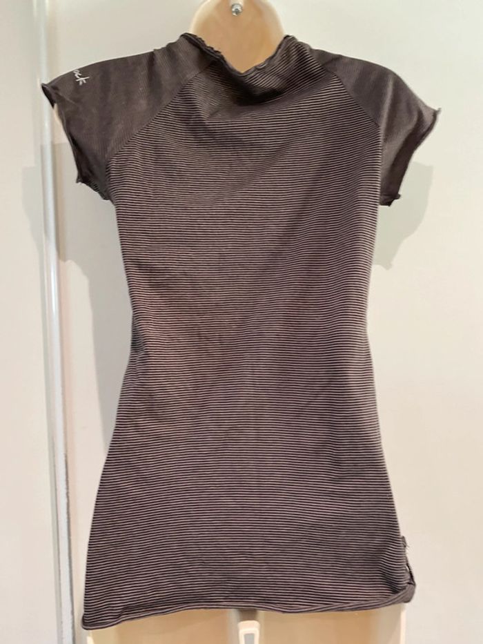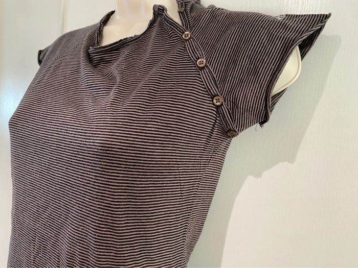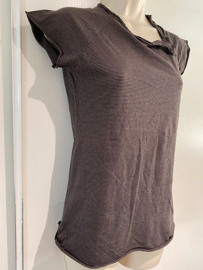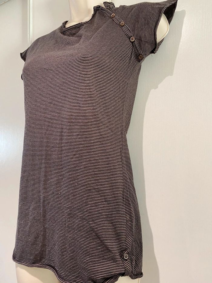 Je vends un T-shirt Il est en très bon état. Taille SA la ligne il est en coton 100 % T-shirt taille S. 100 % coton Bizzbee. Style Marin Il y a des petites pattes sur chaque côté dans le bas. Il est marron et noire Cho 90 oran22
