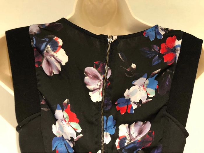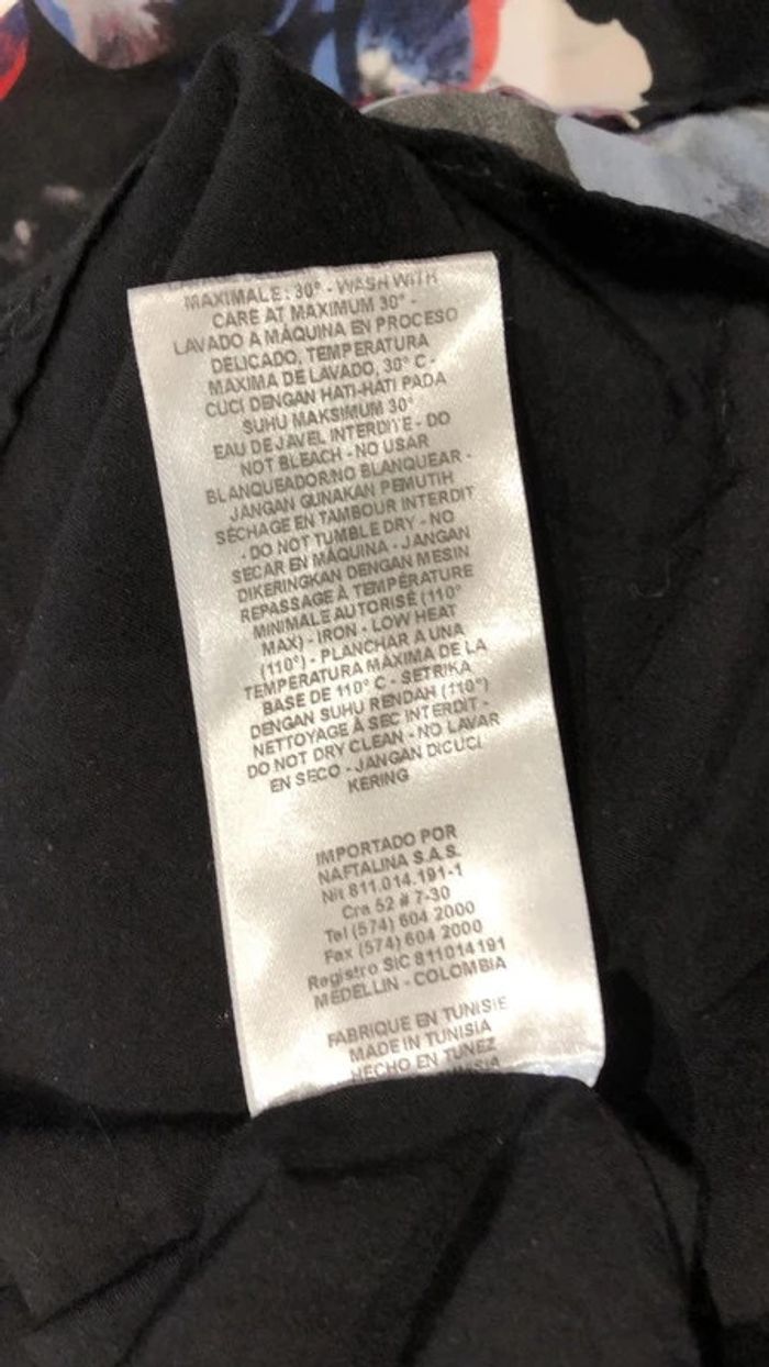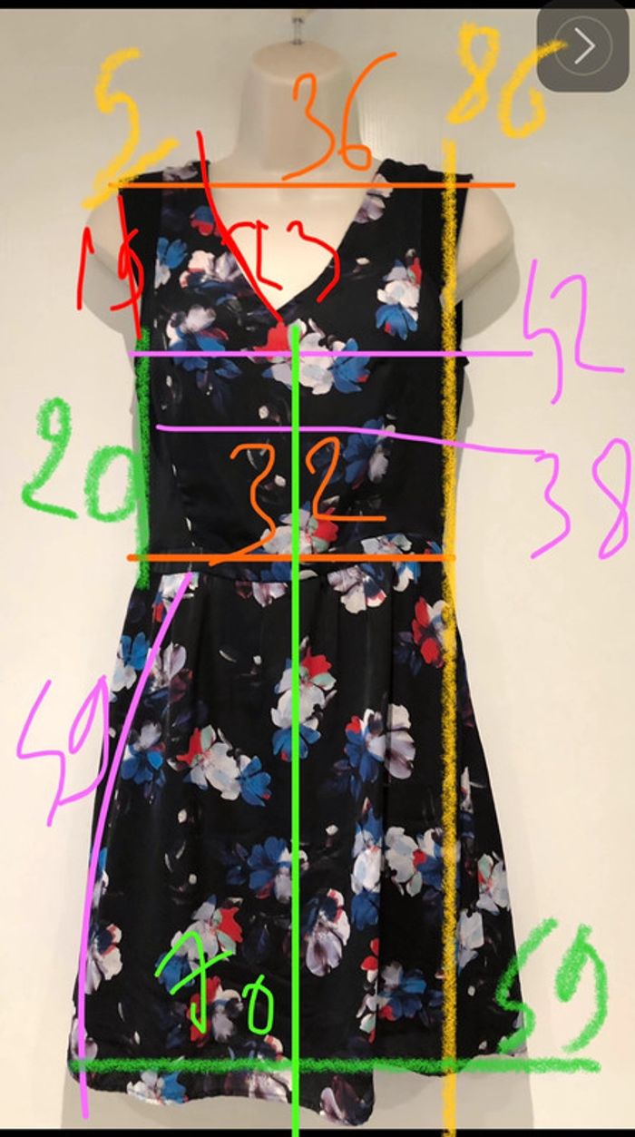 Je vends une petite robe De la marque Naf-Naf Taille 34 Elle est à fleurs Bleu blanc rouge noir Elle possède une grande fermeture à glissière en métal dans le dos La composition est sur l’étiquette en photo Les mesures sont sur une Photo également d’autres renseignements sur demande Robe Naf-Naf taille 34 Choup lbc180/2