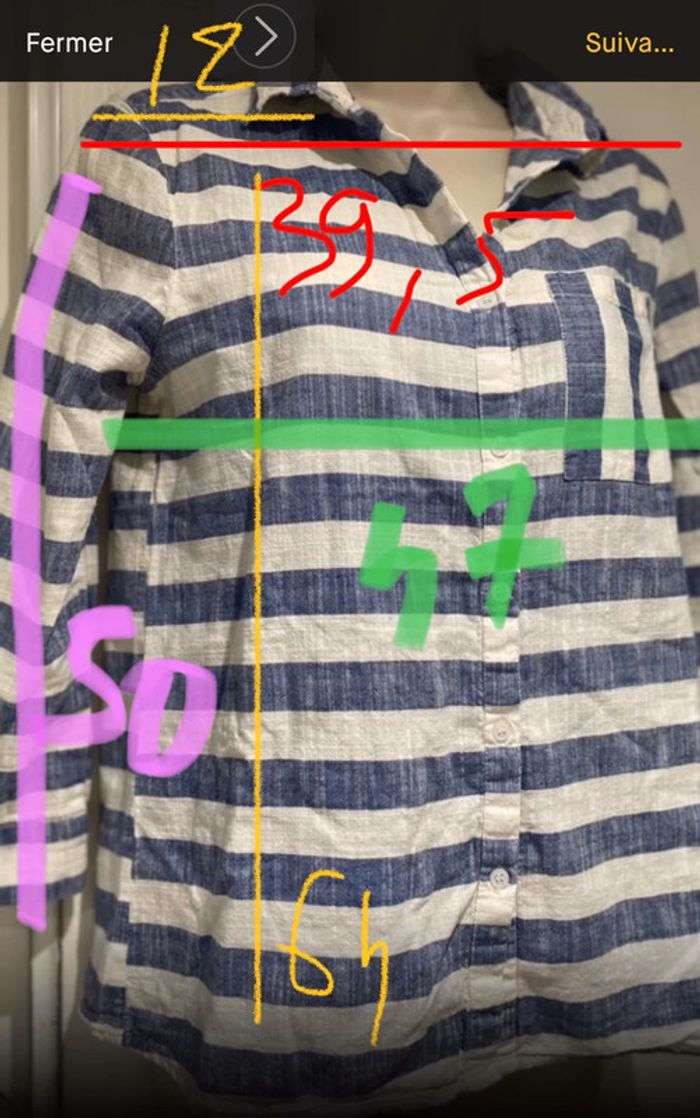Je vends une chemise Chemise coton Galerie Lafayette taille S De la marque Galeries Lafayette 100 % coton Elle est en parfait état Les mesures sont données sur photo Choup lbc/ 140/1 Taille S