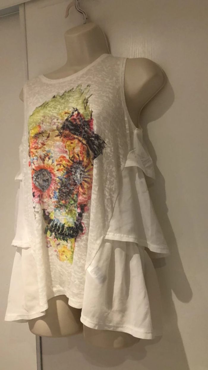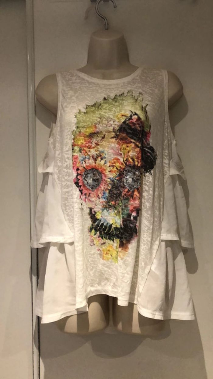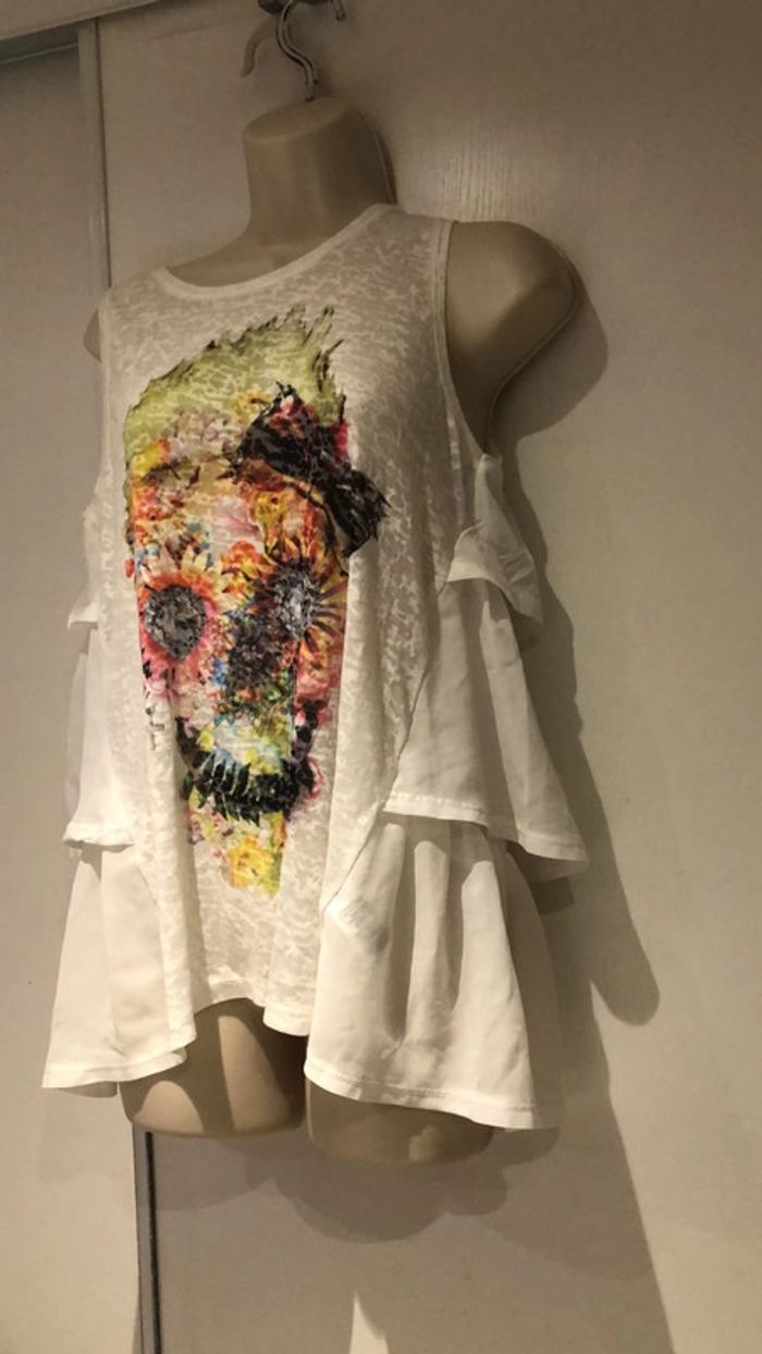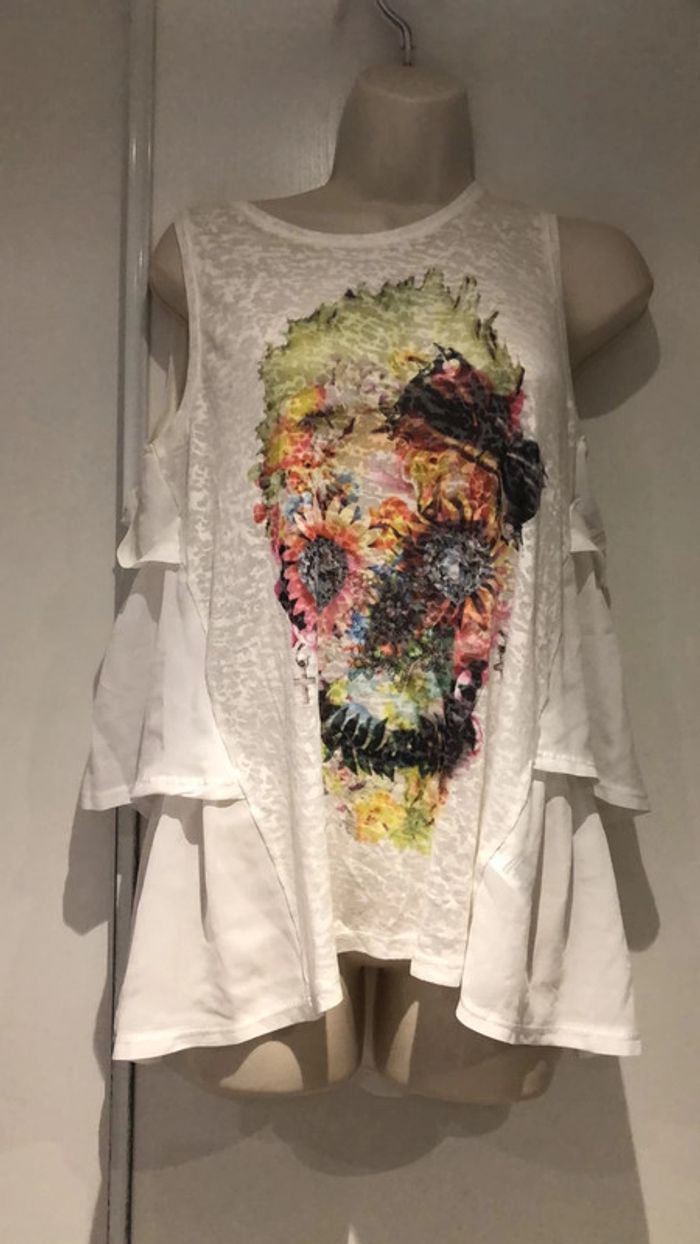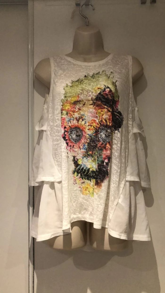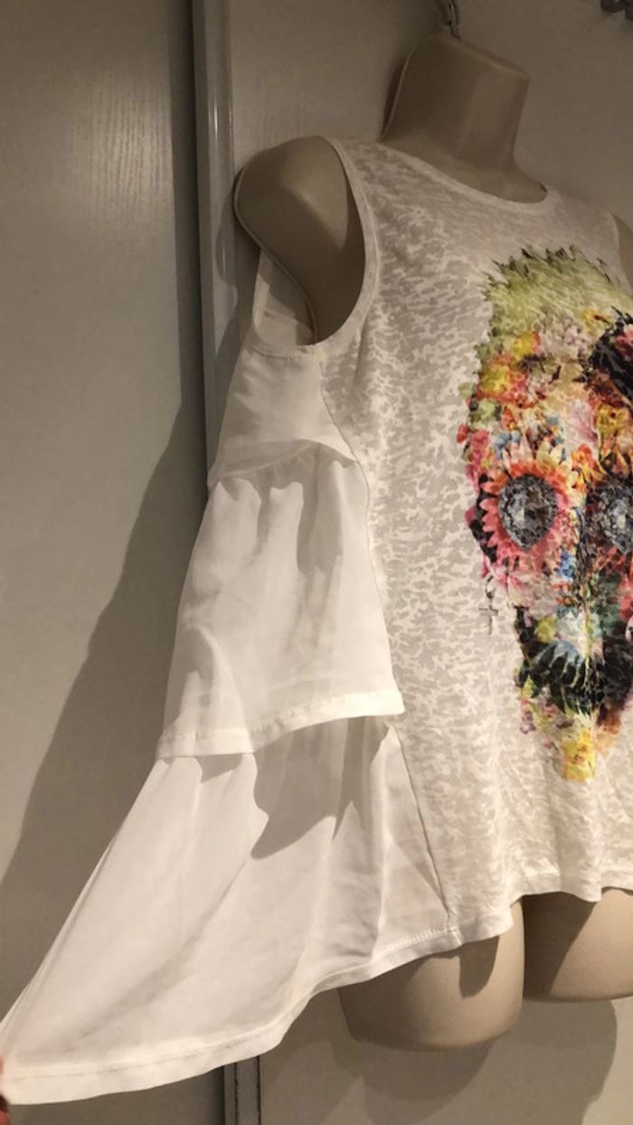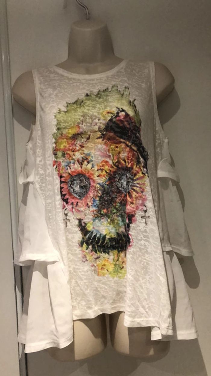 Je vends ce Petit haut en forme de T-shirt le devant est plus habillé sur les côtés. T-shirt de la redoute taille 38 40 France Il est en parfait état comme neuf de la marque redoute création Taille 38 40 France voir les autres tailles sur l’étiquette en photo. La partie devant est élastique extensible sous les aisselles elle passe de 47cm à plus de 58 cm Largeur sous les aisselles 47 cm sans tirer sur la matière longueur milieu de l’épaule jusqu’en bas 65 cm devant 71 cm pour le dos longueur milieu du dos jusqu’en bas 70 cm Il y a une tête qui ressemble aux têtes de mort mexicaine devant 301121/100 B Choup lbc