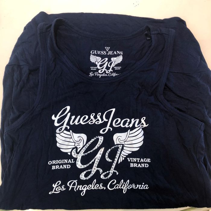 Je vends un T-shirt de la marque Guess jeans T-shirt Guess jeans taille 36 Il est en très bon état Largeur sous les aisselles 38,5 En tirant sur la matière cela monte facilement jusque 59 cm longueur sous les aisselles jusqu’en bas 55 cm De couleur marine et blanc avec des strasse Il est très élastique l’étiquette de composition a été coupé je suppose qu’il est en coton avec une grande majorité de spandex Choup lbc /140/ E