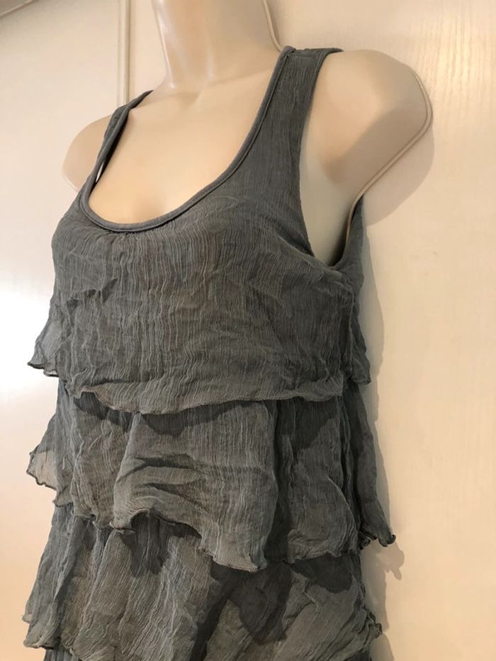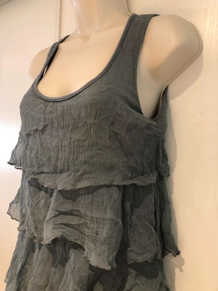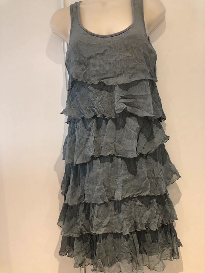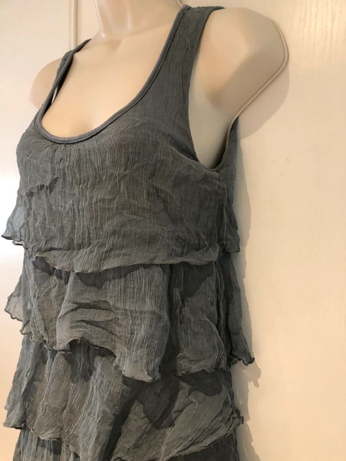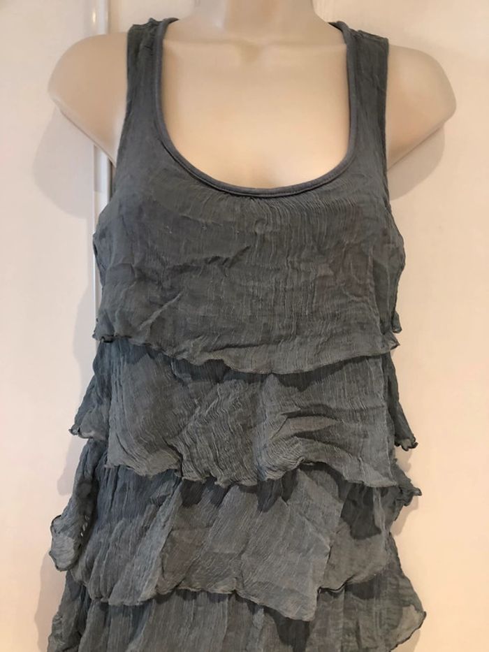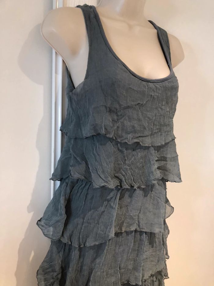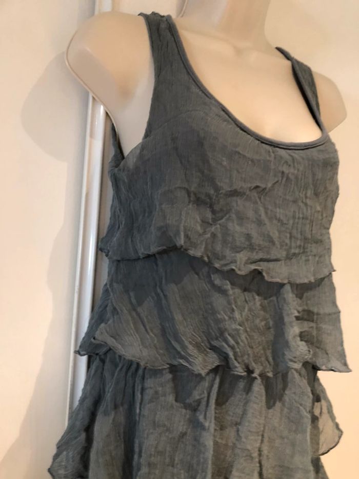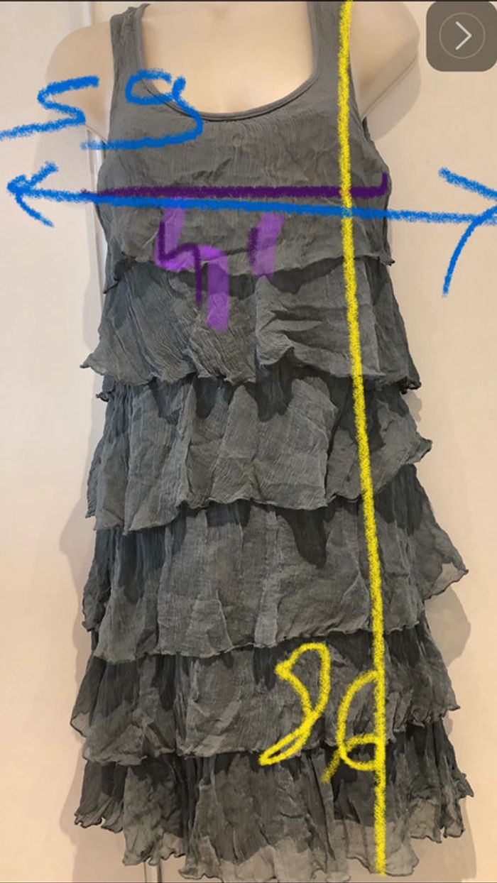 Je vends Une robe en 100 % soie l’extérieur La doublure est en viscose élasthane de la marque la fée Maraboutée Taille 36 Elle est grise La partie volant est en soie Elle est très élastique pour la partie du dessous la largeur sous les aisselles est très extensible voir photo. D’autres renseignements sur demande