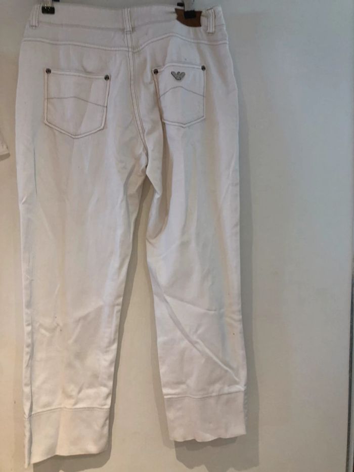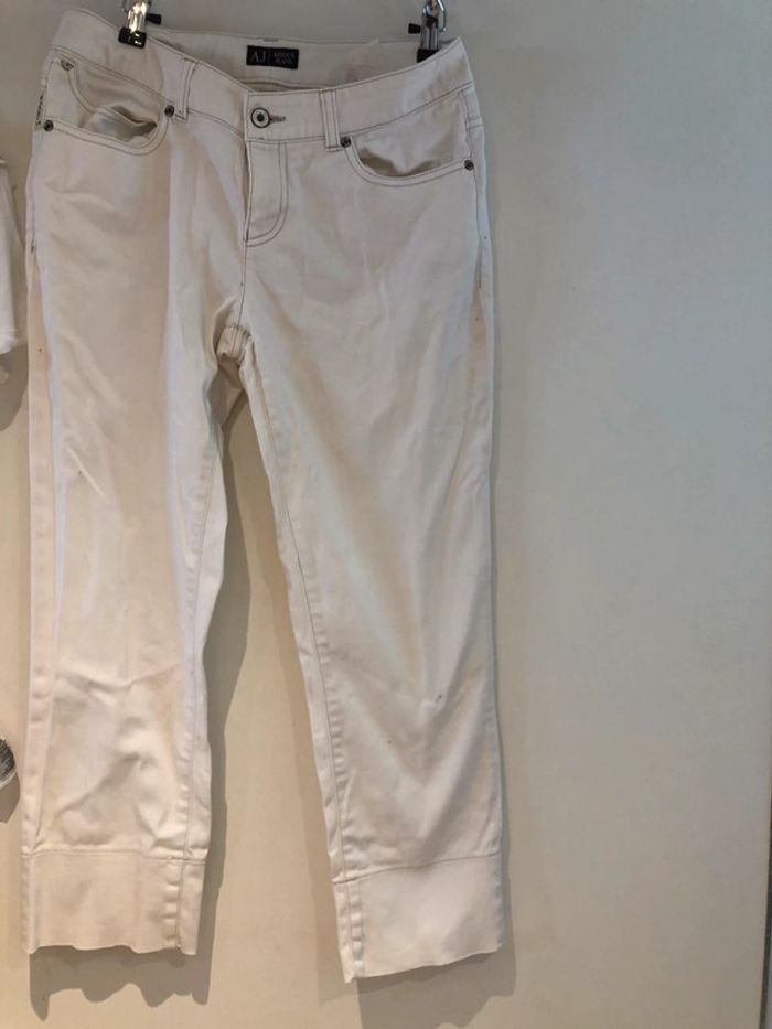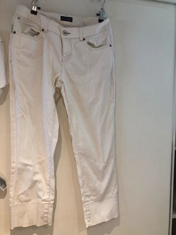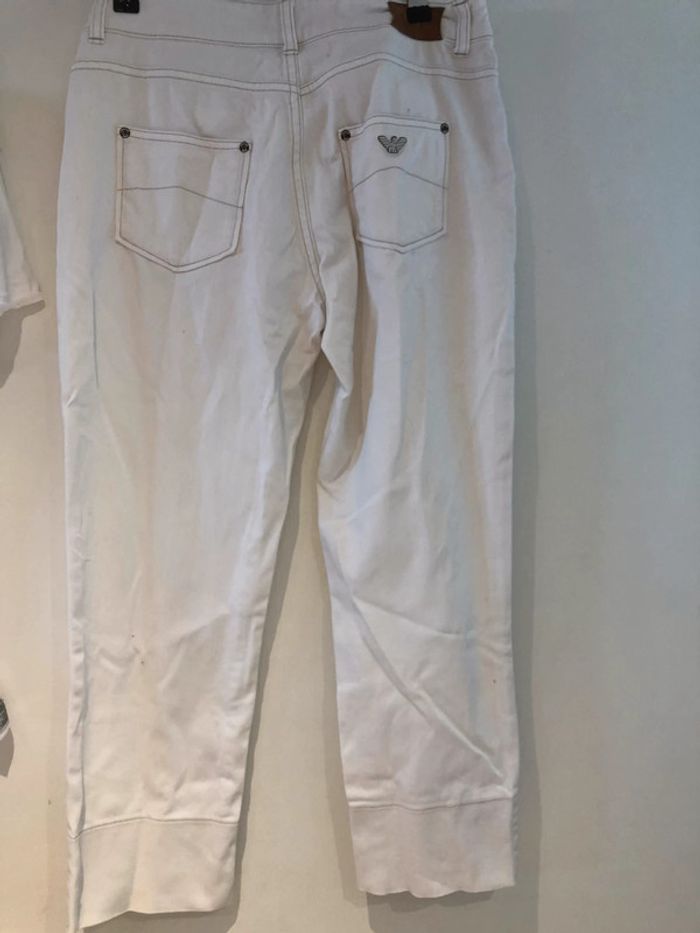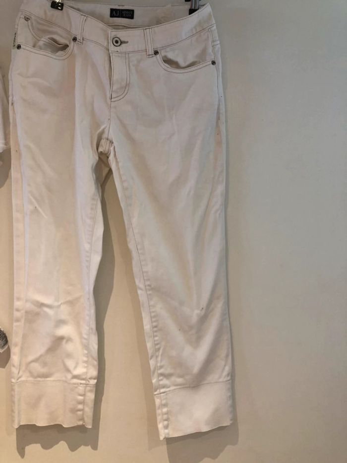 Pantacourt blanc De la marque Armani jeans Il est en très bon état Taille française 38 Je trouve qu’elle taille un peu plus grand Longueur de la ceinture 41,5 Quand On superpose la ceinture devant et derrière.Voir photo numéro deux autrement. Longueur de jambes côté extérieur ceinture comprise 90 cm Longueur de jambes côté intérieur 64,5 Je mesure 1,68 m il arrive en bas de mes mollets donc le haut des chevilles sont découvertes Largeur bas de pantalon 19 cm Largeur au niveau des cuisses à l’entrejambe 32 cm Largeur au niveau des genoux 22 cm Lavables à 40° 99% coton 1% élasthane