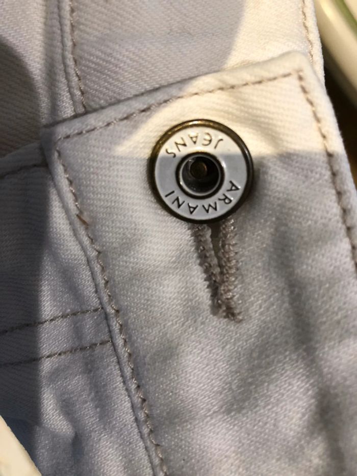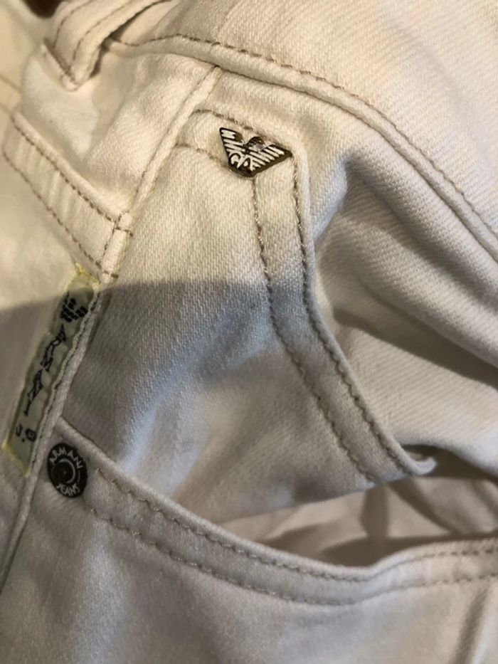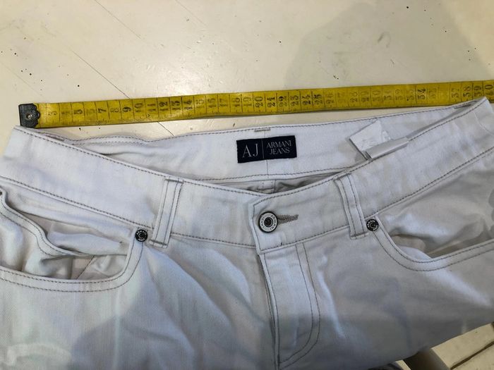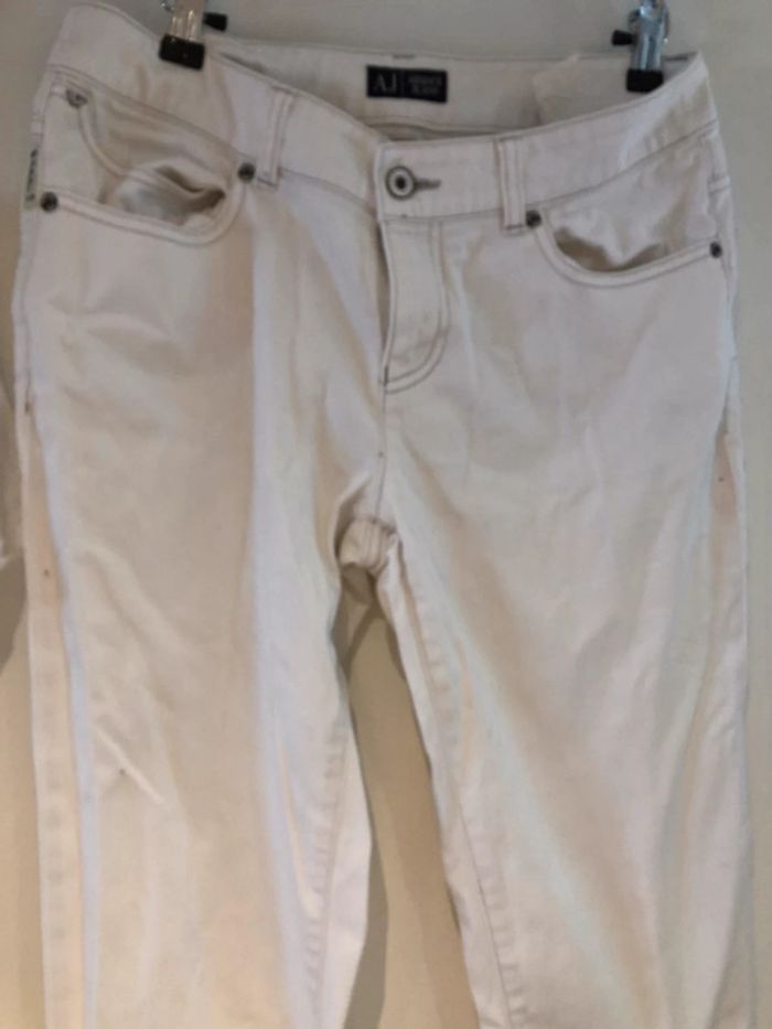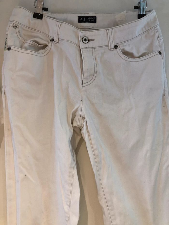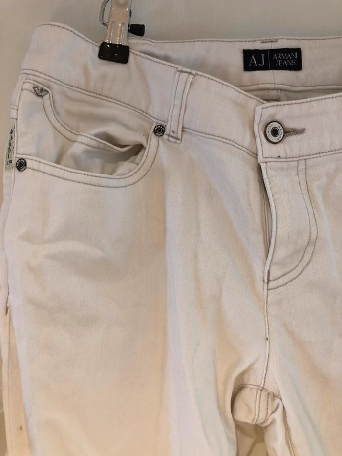 Pantacourt blanc De la marque Armani jeans Il est en très bon état Taille française 38 Je trouve qu’elle taille un peu plus grand Longueur de la ceinture 41,5 Quand On superpose la ceinture devant et derrière.Voir photo numéro deux autrement. Longueur de jambes côté extérieur ceinture comprise 90 cm Longueur de jambes côté intérieur 64,5 Je mesure 1,68 m il arrive en bas de mes mollets donc le haut des chevilles sont découvertes Largeur bas de pantalon 19 cm Largeur au niveau des cuisses à l’entrejambe 32 cm Largeur au niveau des genoux 22 cm Lavables à 40° 99% coton 1% élasthane