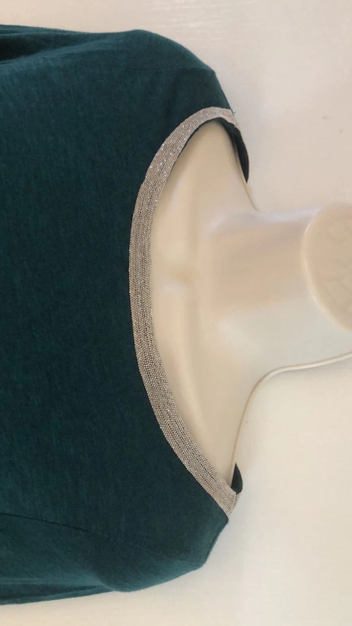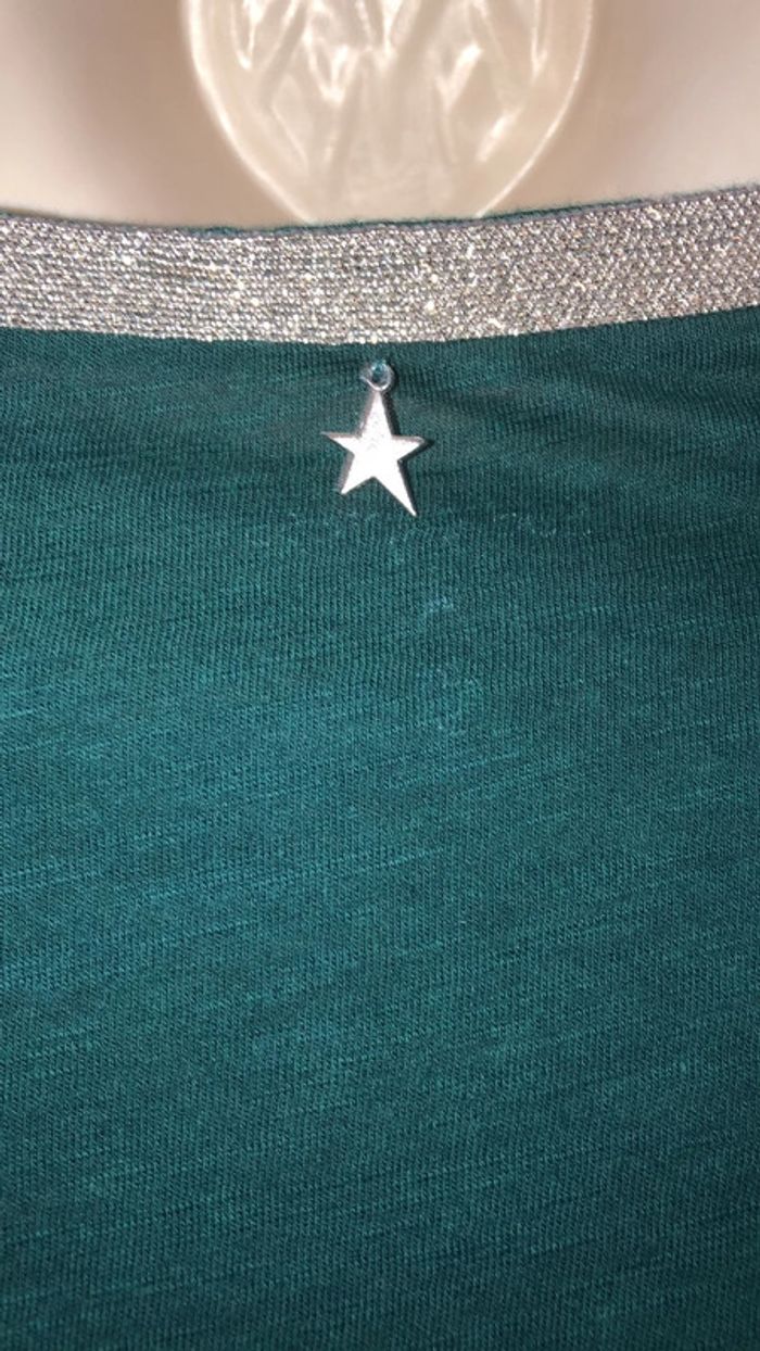 Je vends un T-shirt vert Il est en parfait état Comme neuf Taille S Il possède une bande légèrement argenté et doré autour du col Largeur d’une épaule 4 cm Longueur d’une manche 43,5 cm Largeur sous les aisselles 55 cm Largeur d’une épaule à l’autre 36,5 cm Elle mesure 1 cm de large Largeur d’une épaule 4,5 cm longueur d’une manche 43 cm Largeur sous les aisselles 45 cm Largeur d’une épaule à l’autre 36,5 cm Longueur milieu de l’épaule jusqu’en bas 68 cm 140 E