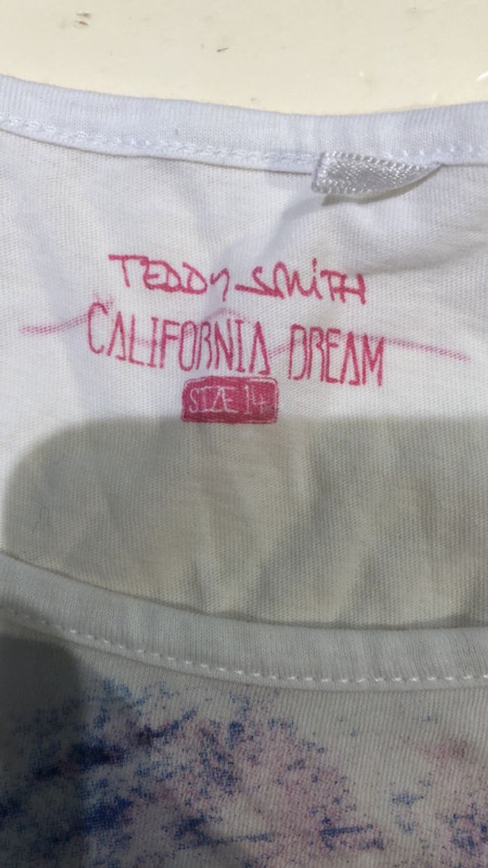 Je vends un T-shirt Il est en très bon état De la marque Teddy Smith garçon Léni il est en taille 14 ans Lavables à 30° 100 pour cent coton Longueur milieu de l’épaule devant jusqu’en bas 59 cm Longueur de manche jusqu’au col 20 cm Longueur milieu devant jusqu’en bas 45 cm Longueur milieu du dos jusqu’en bas 60 cm Largeur sous les aisselles 49 cm Teddy Smith California Dream 14 ans 75/E