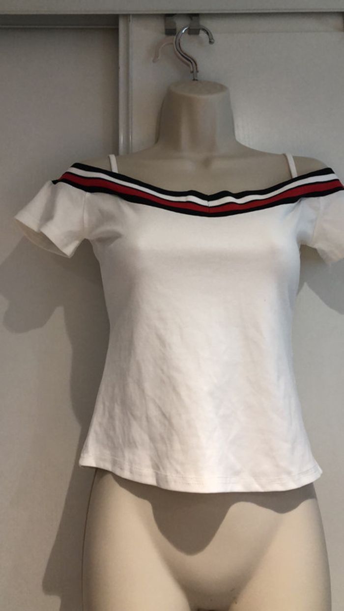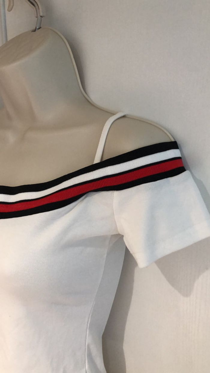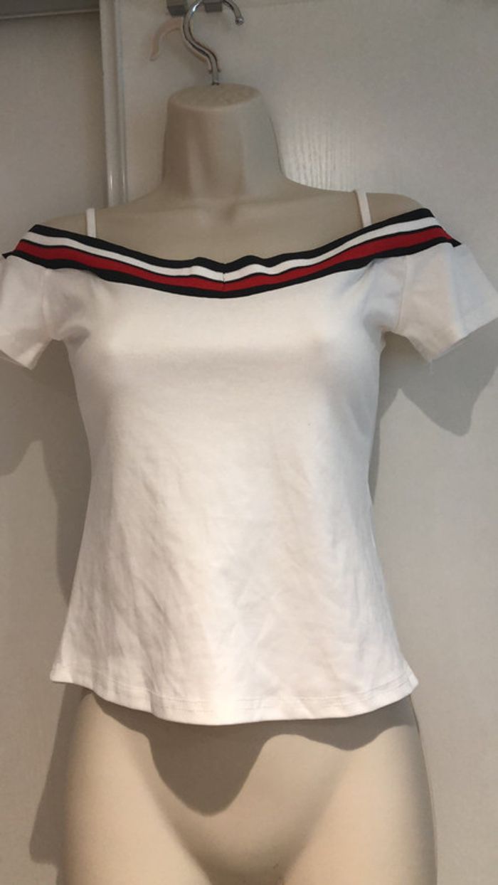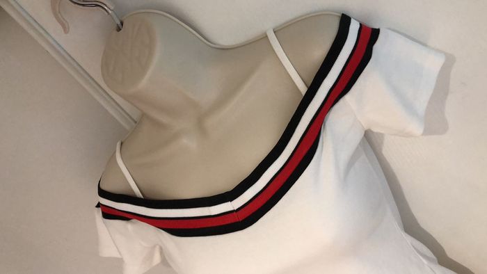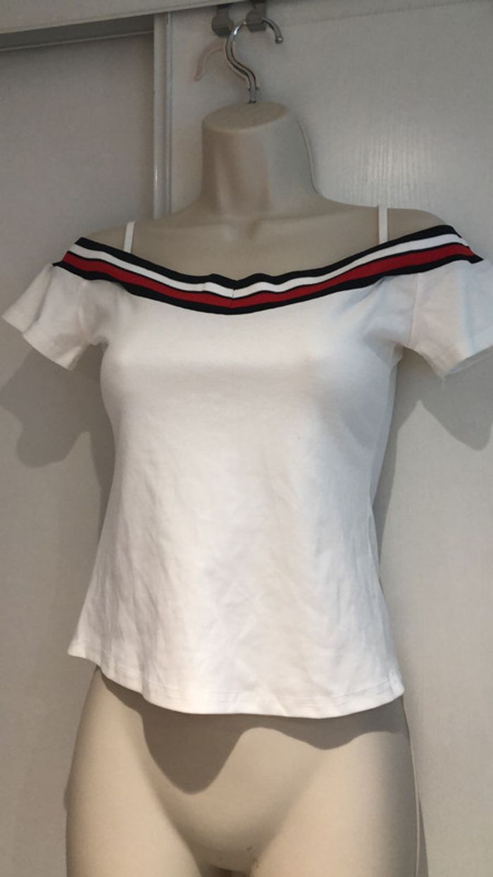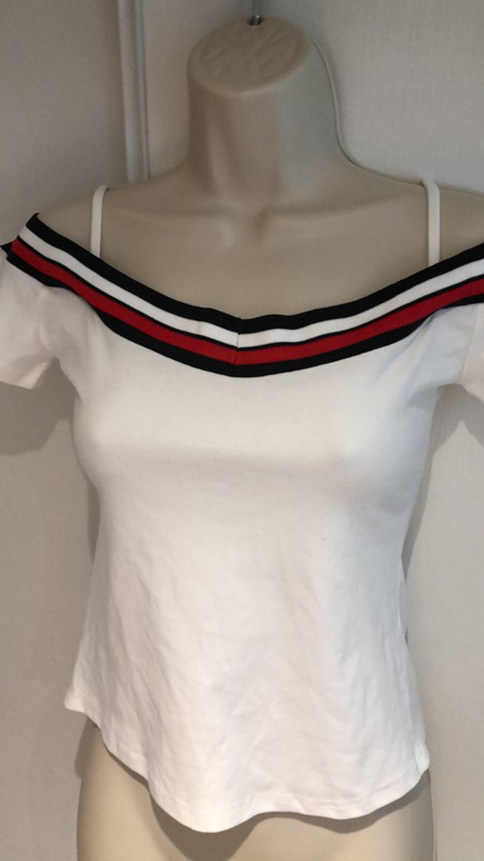 Je vends un petit top épaules découvertes La marque a été coupé Il est neuf Taille M Longueur milieu de la bande noir rouge blanc au bas de la Manche jusqu’en bas 44 cm Largeur sous les aisselles 39 cm largeur bas de T-shirt 38 cm largeur au niveau de la taille 34 cm largeur de la bande Tricolore 4 cm Longueur milieu du longueur de manche 7 cm 100 B
