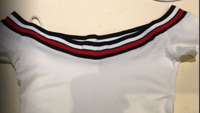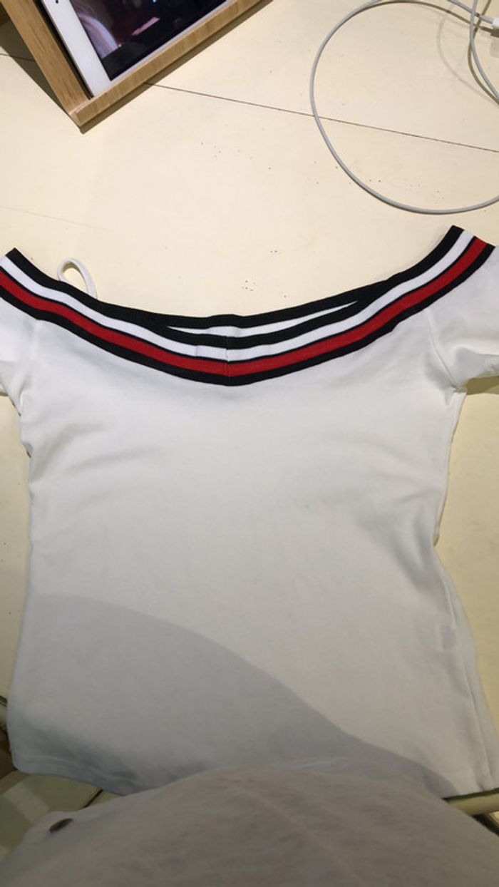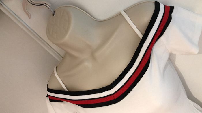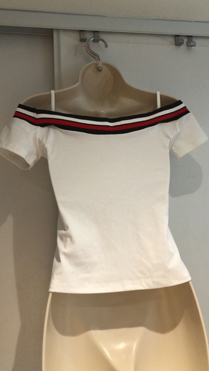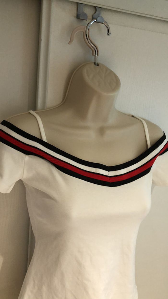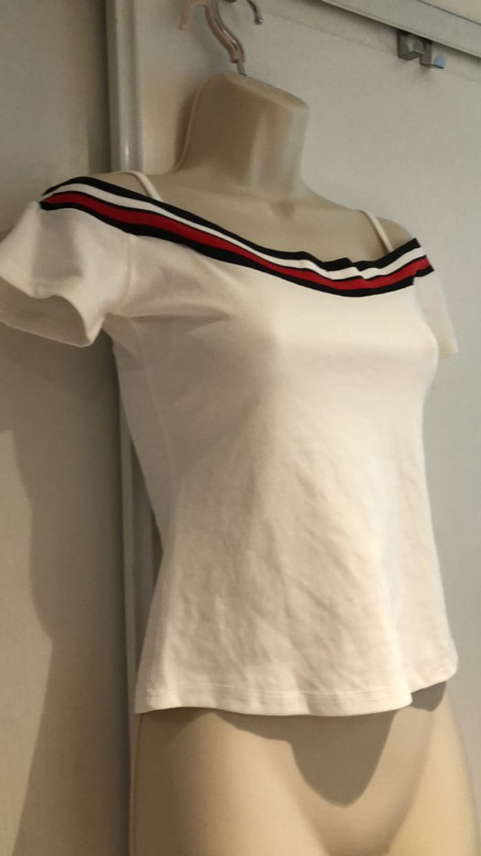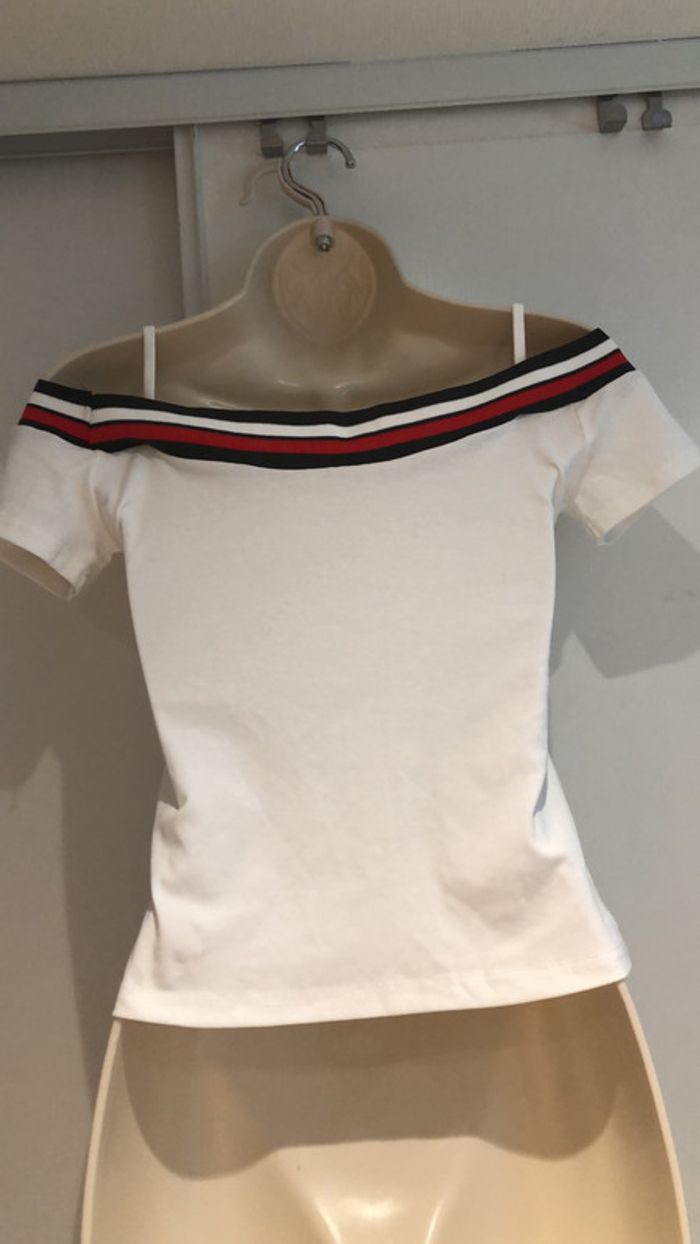 Je vends un petit top épaules découvertes La marque a été coupé Il est neuf Taille M Longueur milieu de la bande noir rouge blanc au bas de la Manche jusqu’en bas 44 cm Largeur sous les aisselles 39 cm largeur bas de T-shirt 38 cm largeur au niveau de la taille 34 cm largeur de la bande Tricolore 4 cm Longueur milieu du longueur de manche 7 cm 100 B