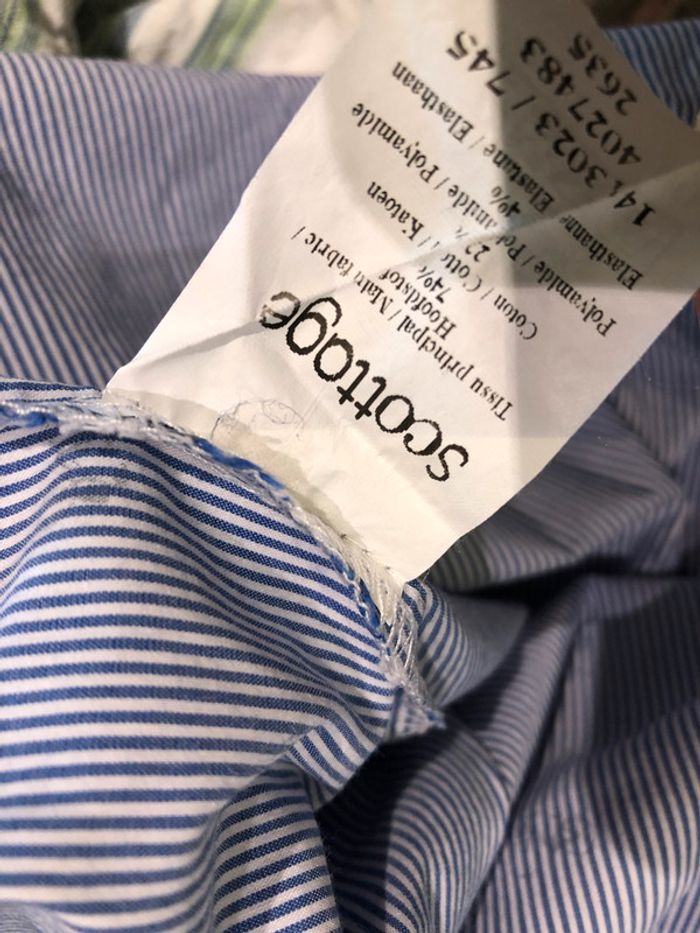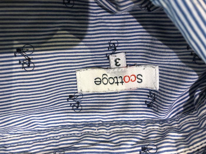 Je vends une chemise bleue et blanche de la marque scottage Elle possède une poche sur la poitrine gauche Les boutons sont estampillés du nom de la marque Taille trois équivaut à un 40 La composition et 74 % coton 4 % élasthane 22 % polyamide 130 B