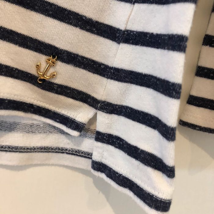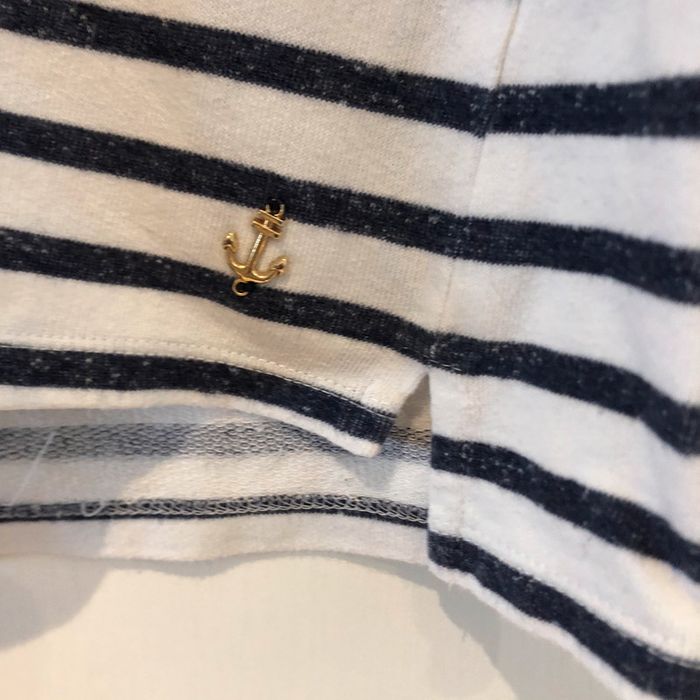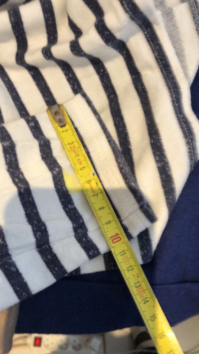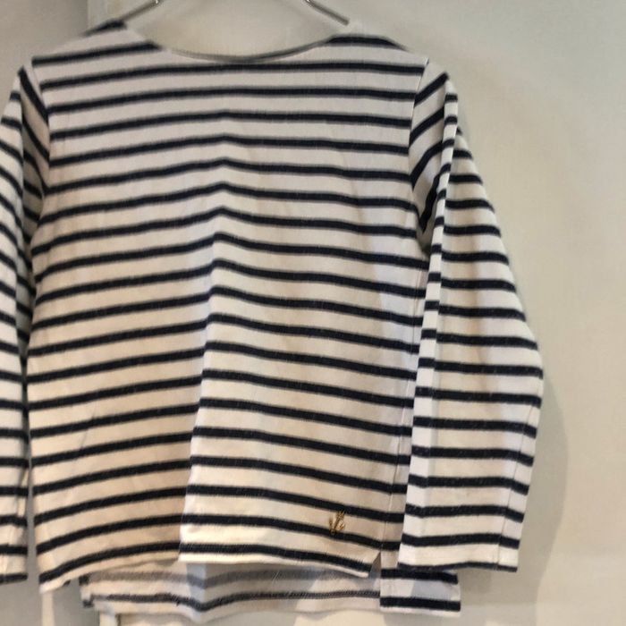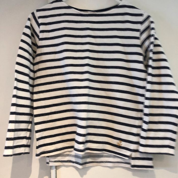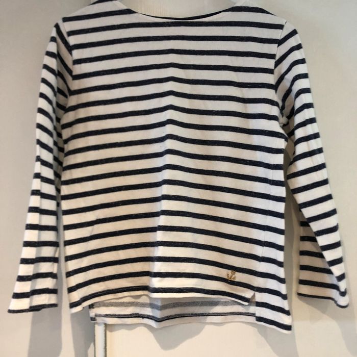 je vends une petite marinière pour filles 9/ 10 ans 140 cm elle est en bon état J’ai mis bon état car il y a une trace de feutre jaune en bas d’une manche… Une fois retroussé cela ne se voit plus.Sinon R.A.S. elle possède une petite encre de Marine en bas à gauche sur le vêtement Largeur sous les aisselles 42 cm Largeur d’une épaule à l’autre 35 cm Largeur d’une épaule 8 cm Longueur d’une manche 46 cm Hauteur de Mariniere milieu de l’épaule jusqu’en bas 51 cm pour le dos 48 cm pour le devant Largeur bas de manches 9 cm