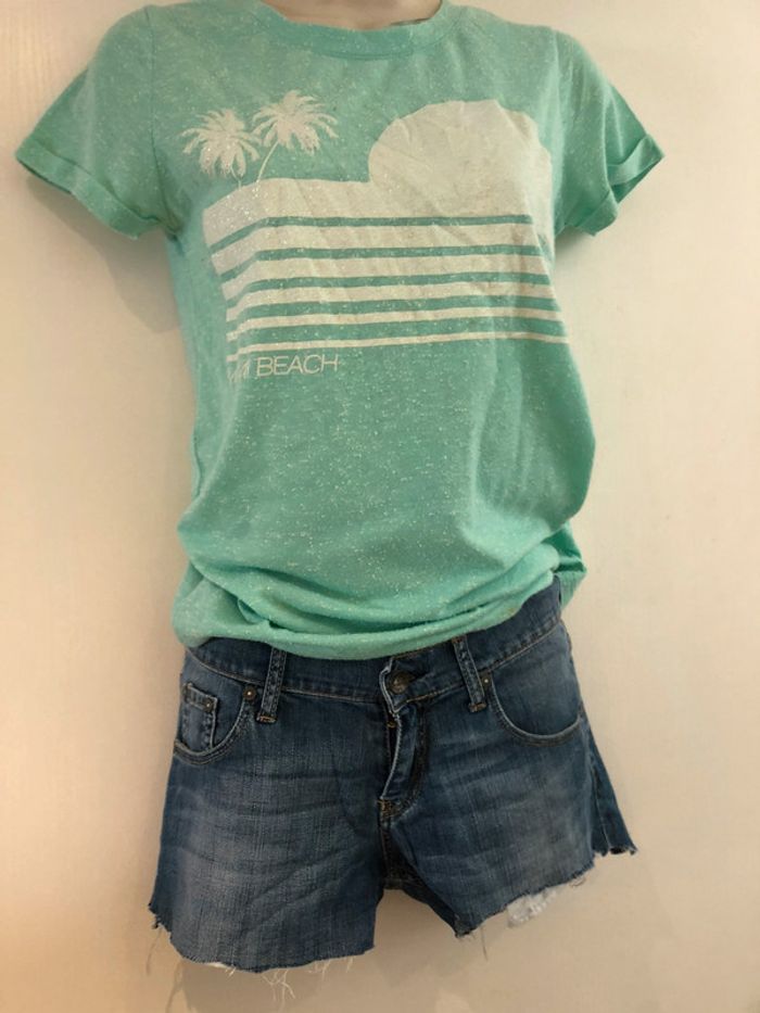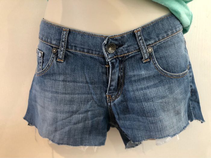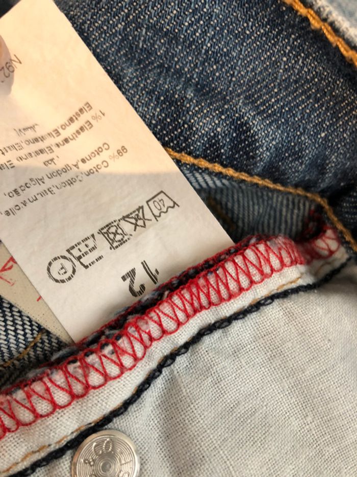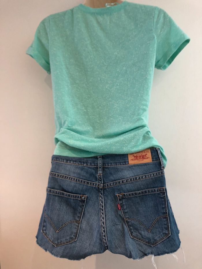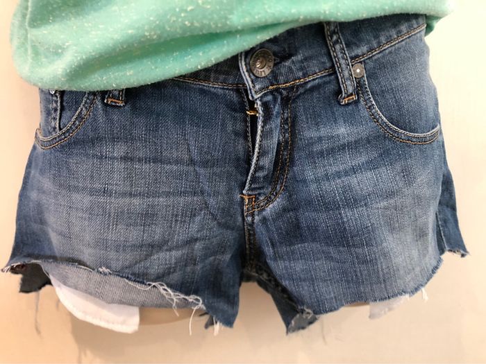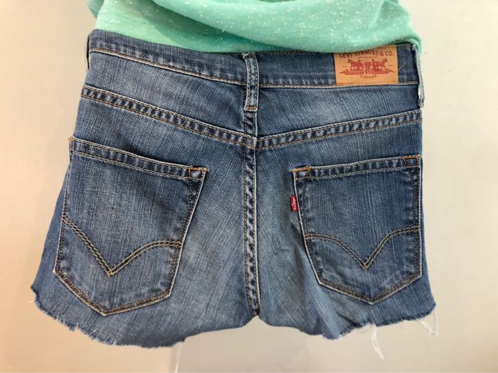 Je vends un short en jean de la marque Lévi-Strauss Il est en taille 12 ans. C’est un pantalon qui a été coupé pour faire un short. Il est en très bon état