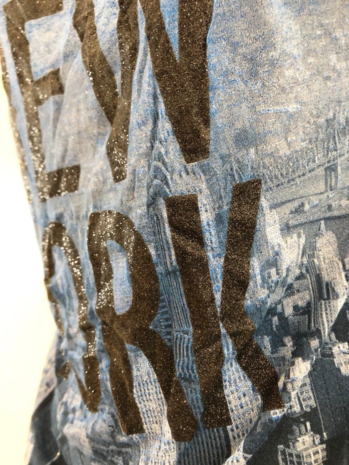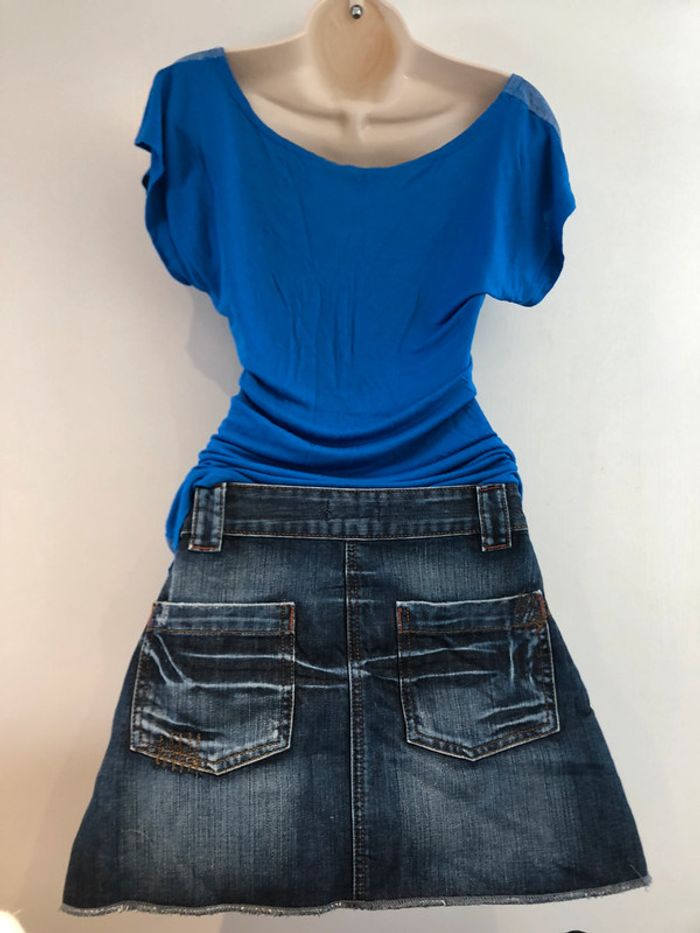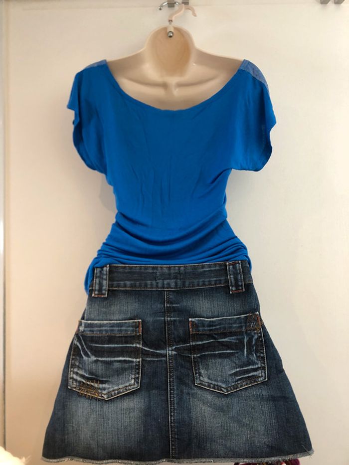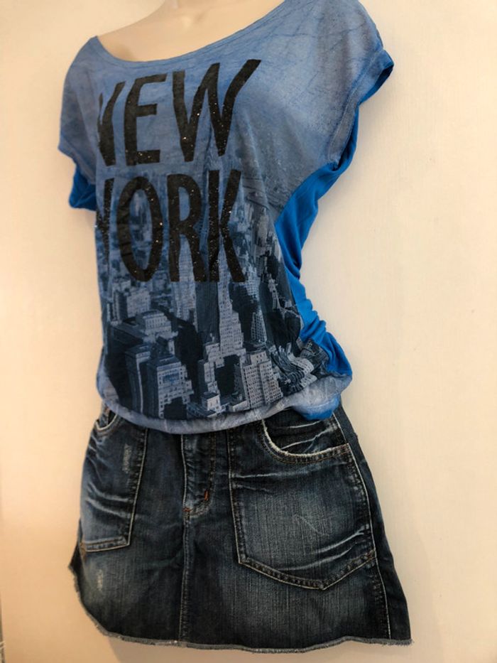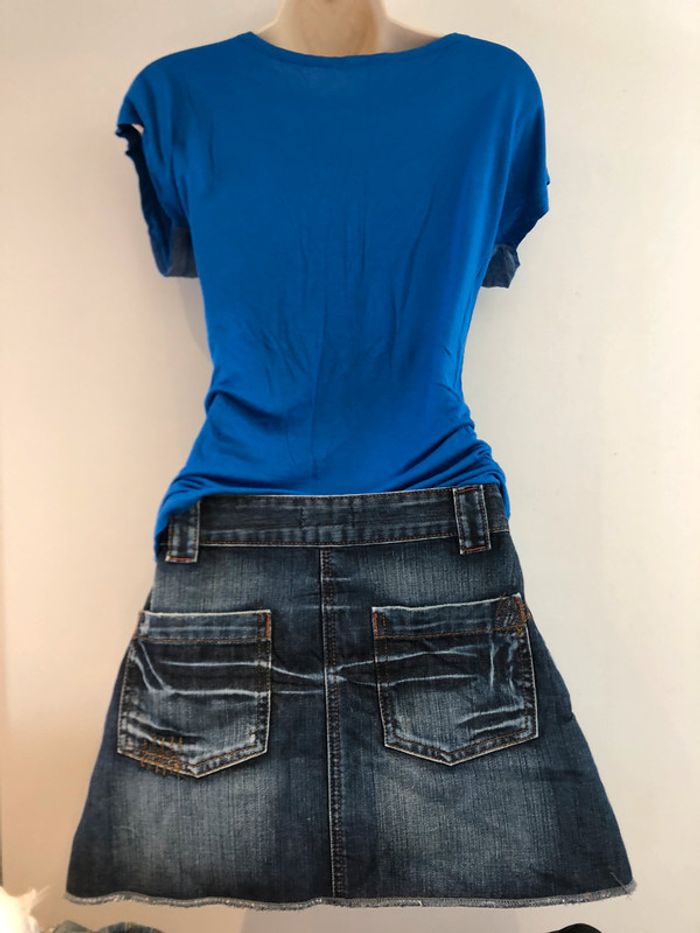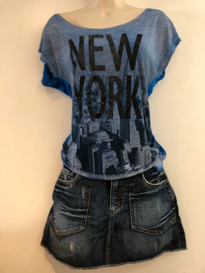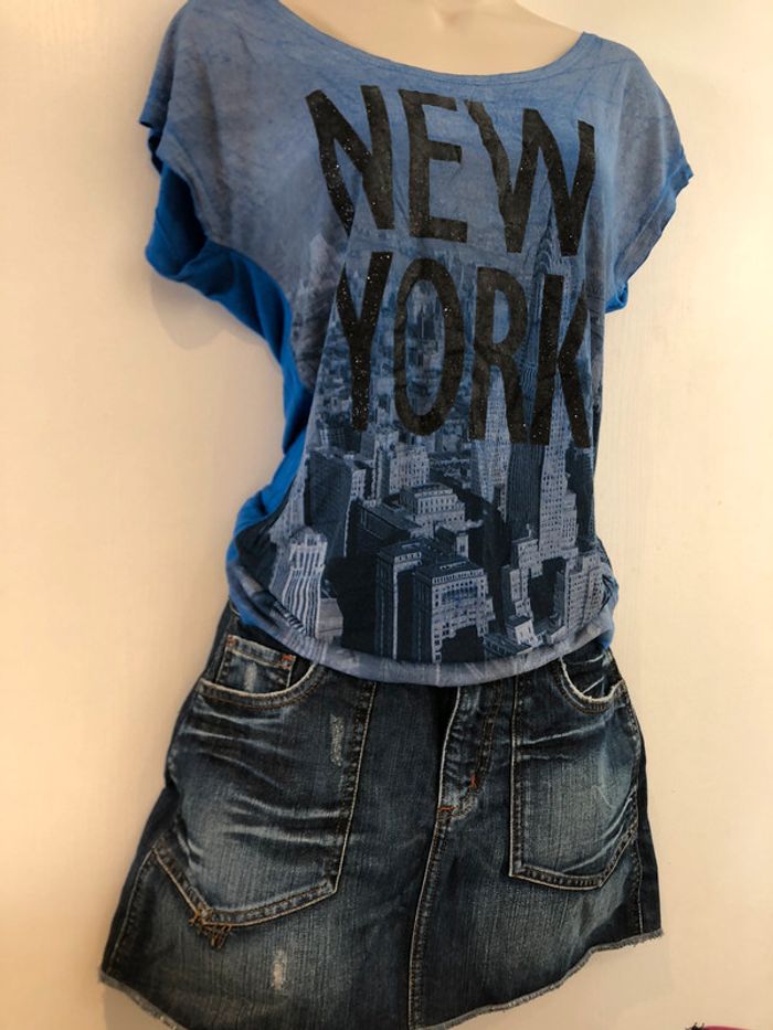 Je vends un T-shirt de la marque Jennyfer il est bleu et noir il est en taille M Longueur milieu du dos jusqu’en bas 55 cm A