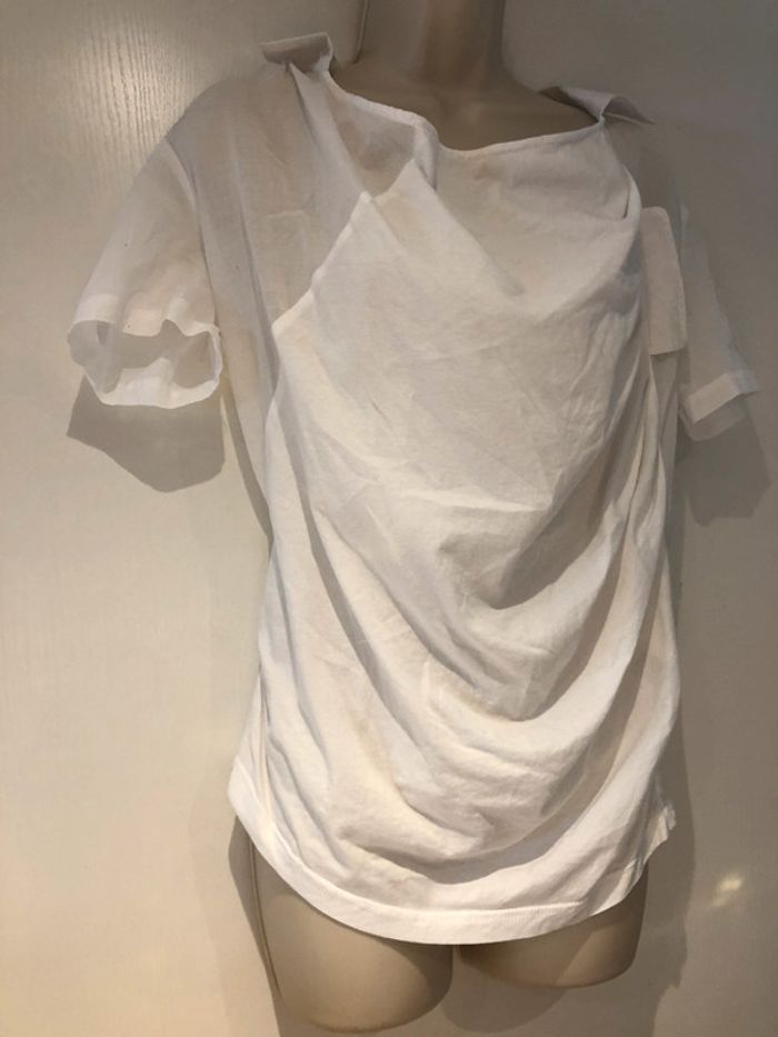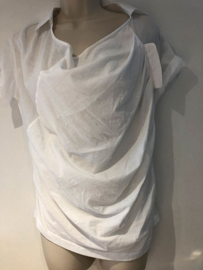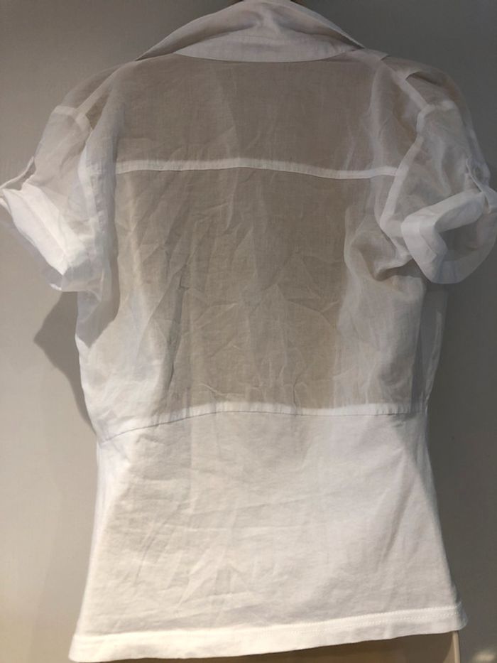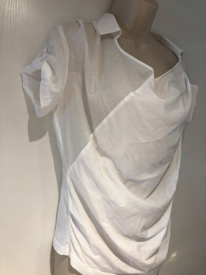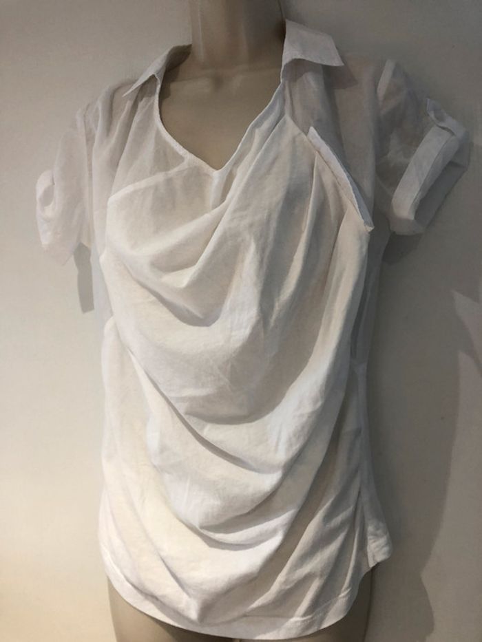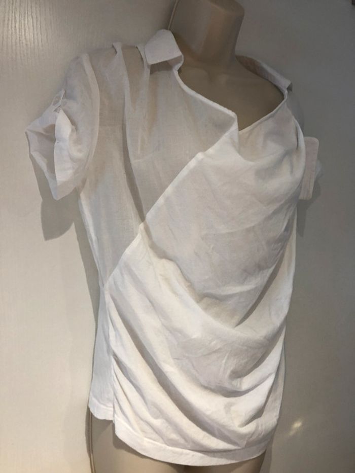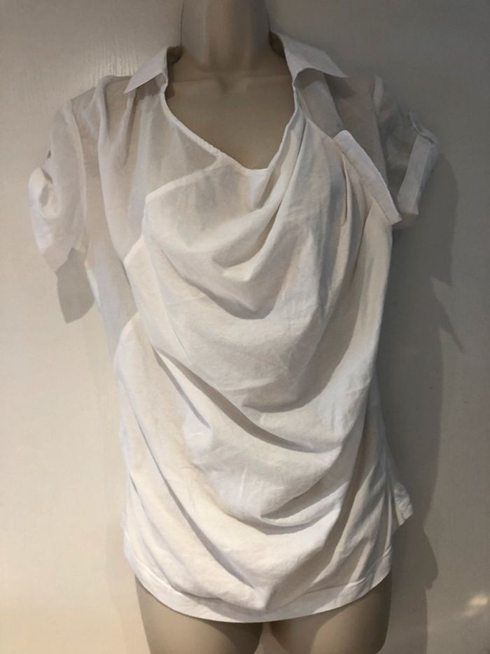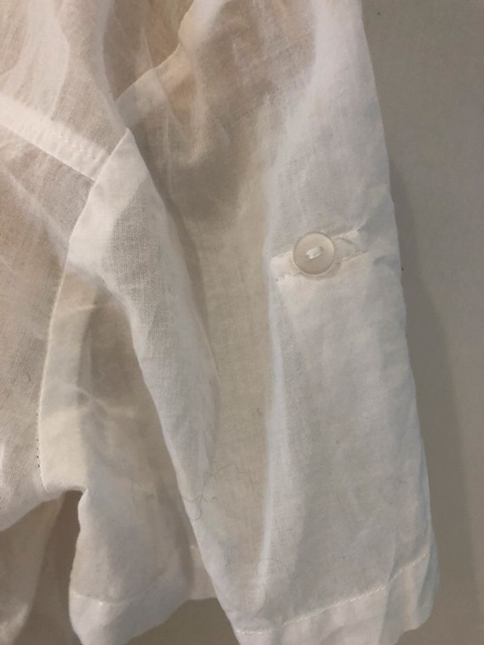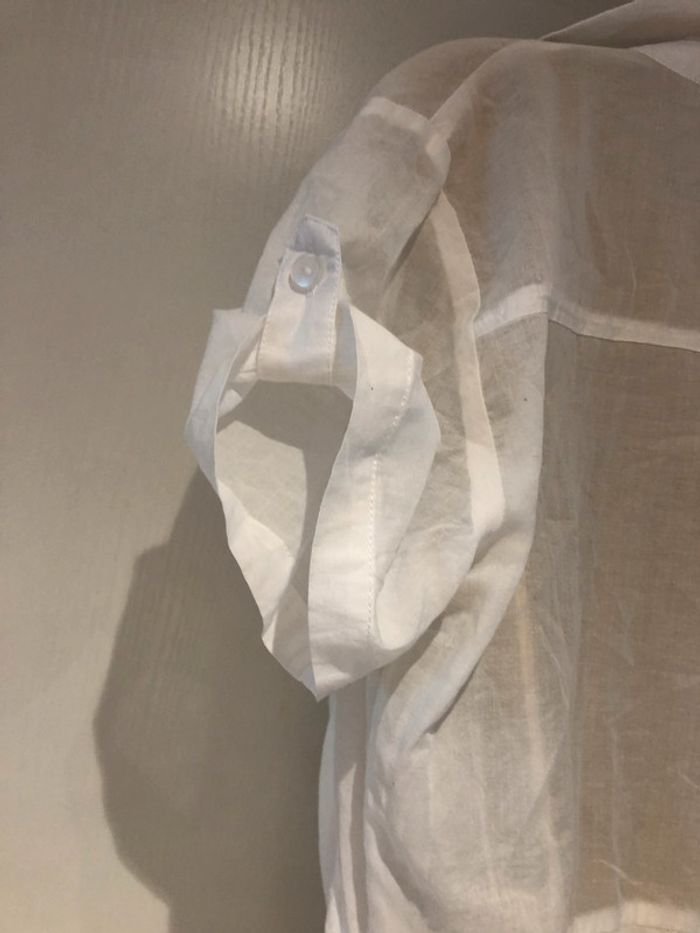 je vends une petite blouse déstructurée. De la marque only Taille 36 100 % coton Elle est en très bon état Elle est transparente dans le dos au niveau des manches et des empiècements des épaules cela descend légèrement jusque sous les aisselles Et Taille. Les manches sont retroussées avec une petite patte et un bouton A