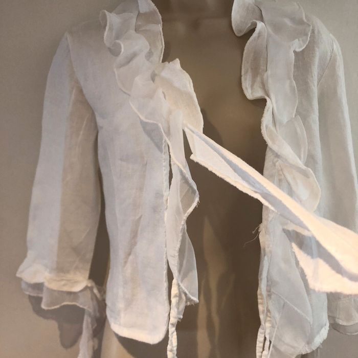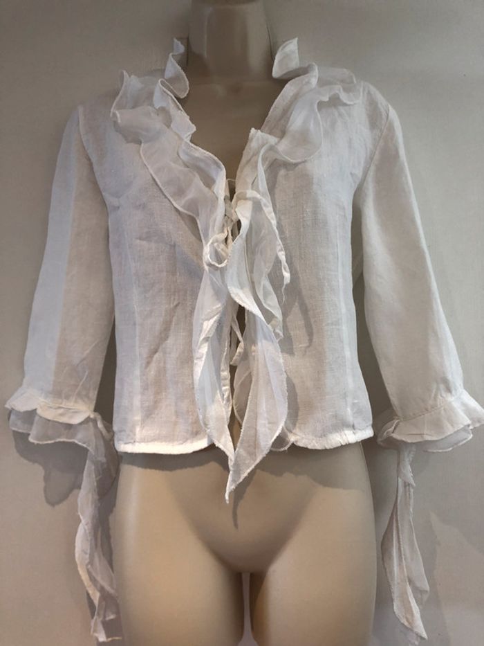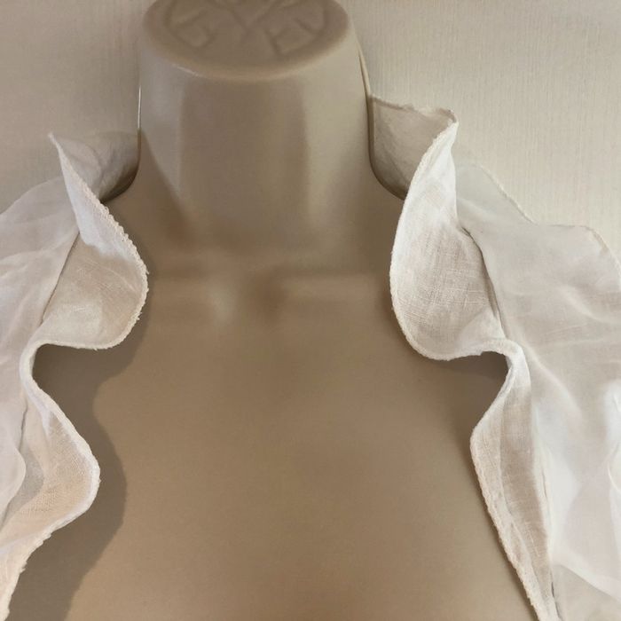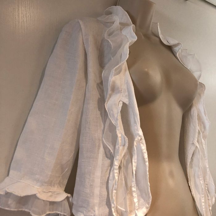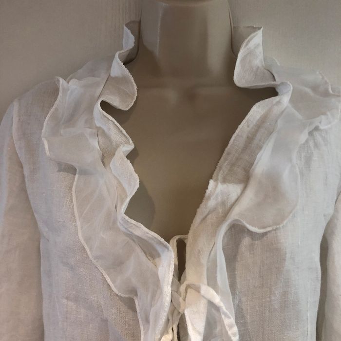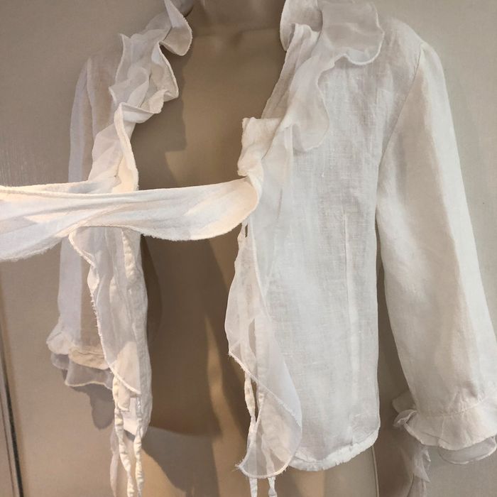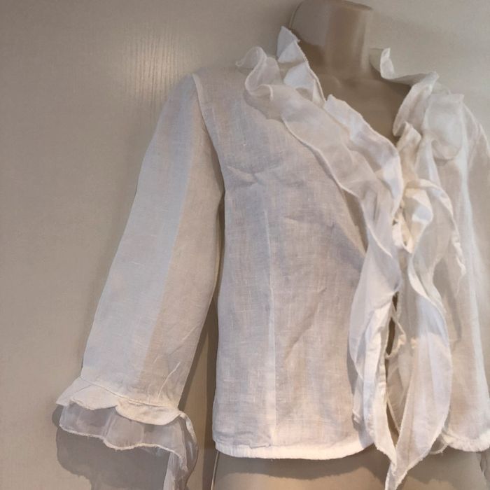 je vends une veste lin blanche taille M elle est en très bon état,l’étiquette de marque est partie et à laissé une trace visible uniquement au Col à l’intérieur sinon RAS A