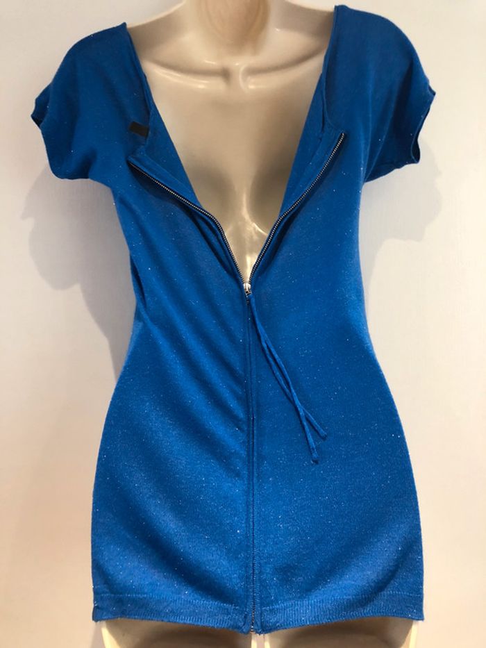 #mademoiselle29120taille34 je vends un Pull long bleu Roy Naf-Naf XS/34 il pourrait convenir pour un petit 36 Mesure et comparer avec les votres il possède une longue fermeture à glissière dans le dos qui fonctionne parfaitement elle est pailletée légèrement sur l’ensemble elle est en 64 % viscose 35 % polyamide 1 % métal le pull est extrêmement doux lavables à 30° en largeur sous les aisselles 40 cm Longueur d’une épaule manche comprise 15 cm Longueur d’une épaule à l’autre et 51 cm de longueur de fermeture à glissière dans le dos 55 cm Longueur milieu devant juste que en bas 43 cm le bas du pull possède une petite fente de 5 cm sur le côté Largeur bas du pull 35cm Largeur de la taille 35 cm Mesures prises sans tirer sur la matière A