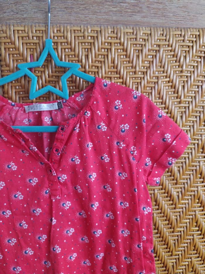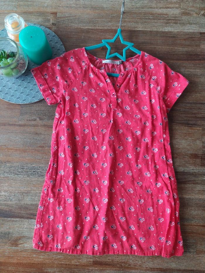 Portée mais encore en train bon état. Adorable robe courte fleurie, rouge aux motifs blancs et bleu marines. 3 boutons au col, 2 poches plates avant. Manches courtes. Ideale printemps-été. CFK, 6 ans