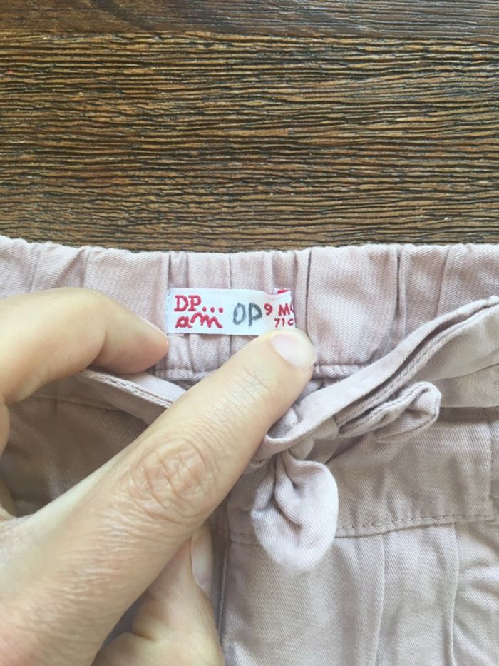 Joli pantalon rose clair/ motif fleur brodé/DPAM/9m/ noeud décoratif devant/2 poches devant