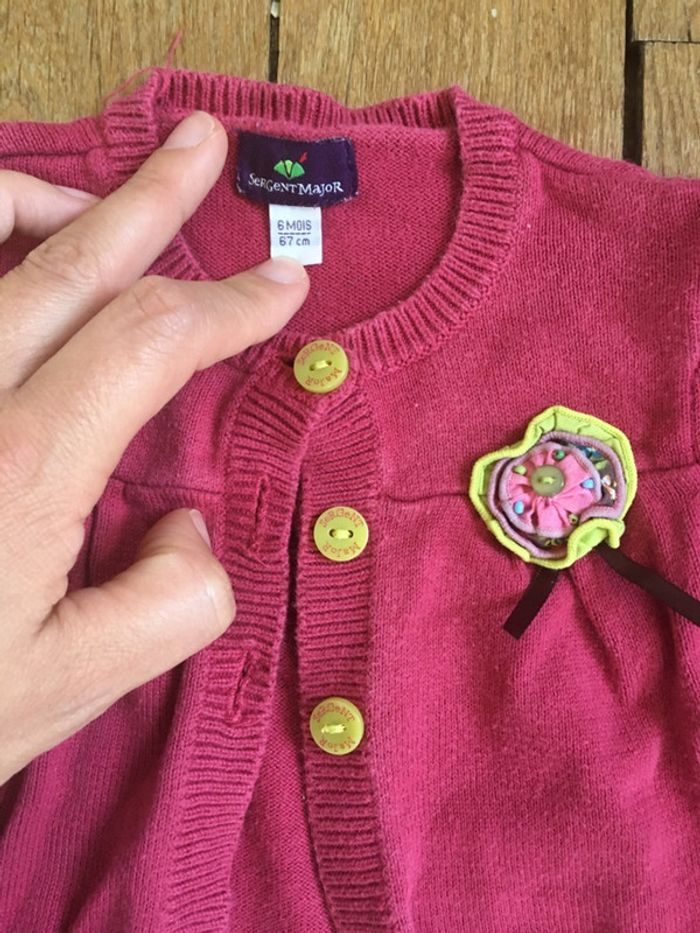 Joli gilet 3 boutons/ sergent major/6m/ fushia et brode jaune fluo