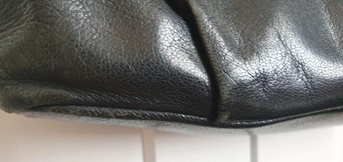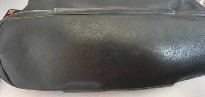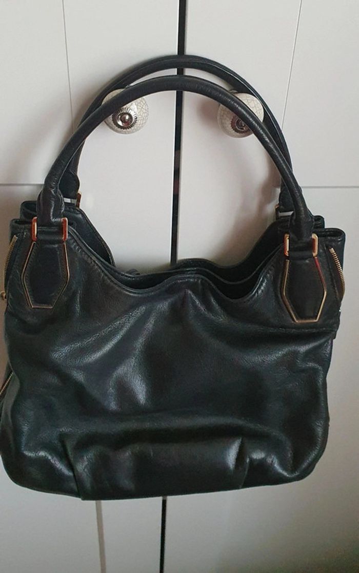 Sac en cuir noir 2 zips sur les côtés (dont 1 où il manque la tirette) Fermeture par pression séparé en 2 poches dont 1 avec divers rangements Dimensions: longueur 36cm, hauteur hors anses 21cm, hauteur des anses 23cm #Sacs_flob76000