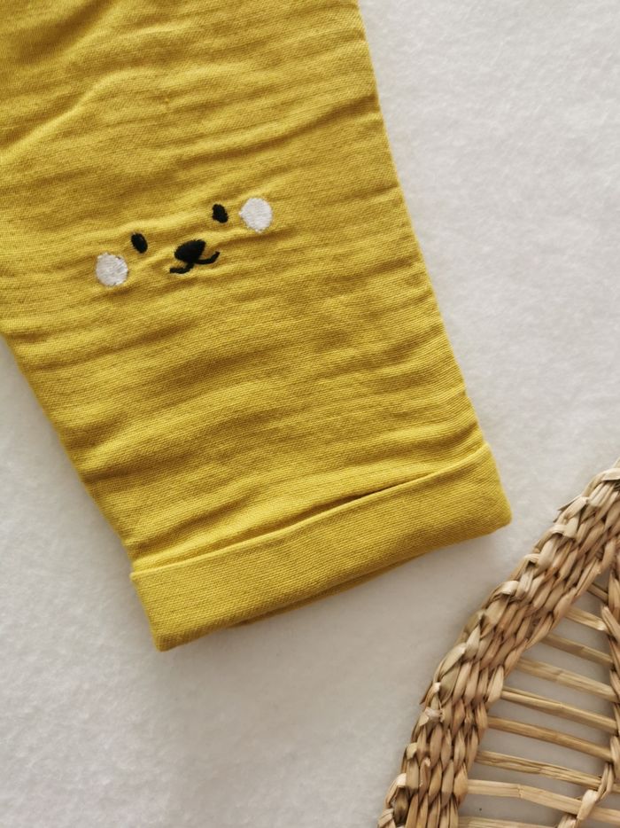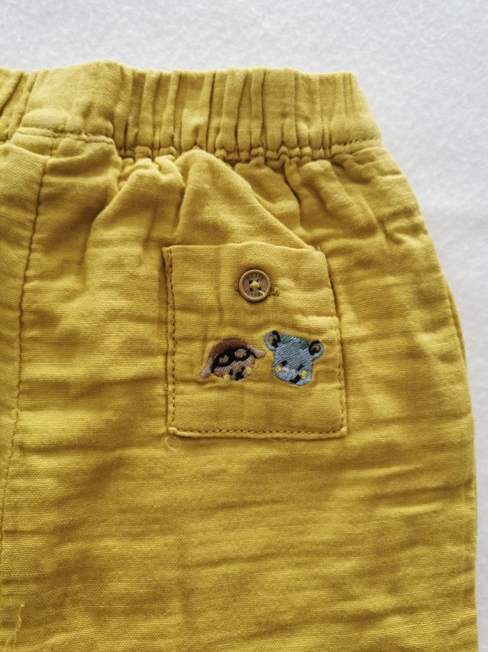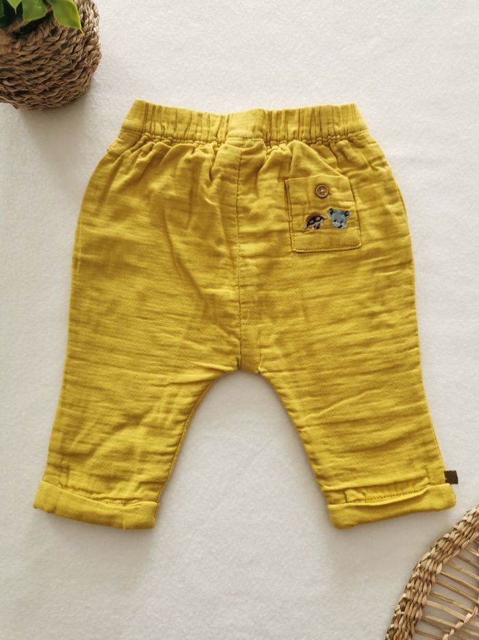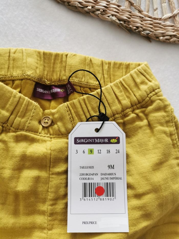👶 Pantalon sarouel 👶 Sergent Major 🖊️ ÉTAT ✅️: Parfait👌 - Avec étiquette 🏷️ - Jamais porté 🆕 🖊️ DESCRIPTION👖: ▪️Taille 9 Mois - 71 cm ▪️Matière: 100% coton ▪️Doublure: 100% coton ▪️Coupe décontractée sarouel ▪️Taille elastiquée facile à enfiler ▪️Bas de jambes à revers ▪️2 Poches latérales - 1 Poche arrière fermée par 1 bouton 🔘 ▪️Détail bouton 🔘 décoratif en bois à la taille ▪️Tête d'animaux 😽 brodées 🧵 sur les genoux et la poche arrière 🐶🦛 ▪️Couleur: Jaune 🟡 Anis/Moutarde 💰Prix boutique: 19.99€ ❤️