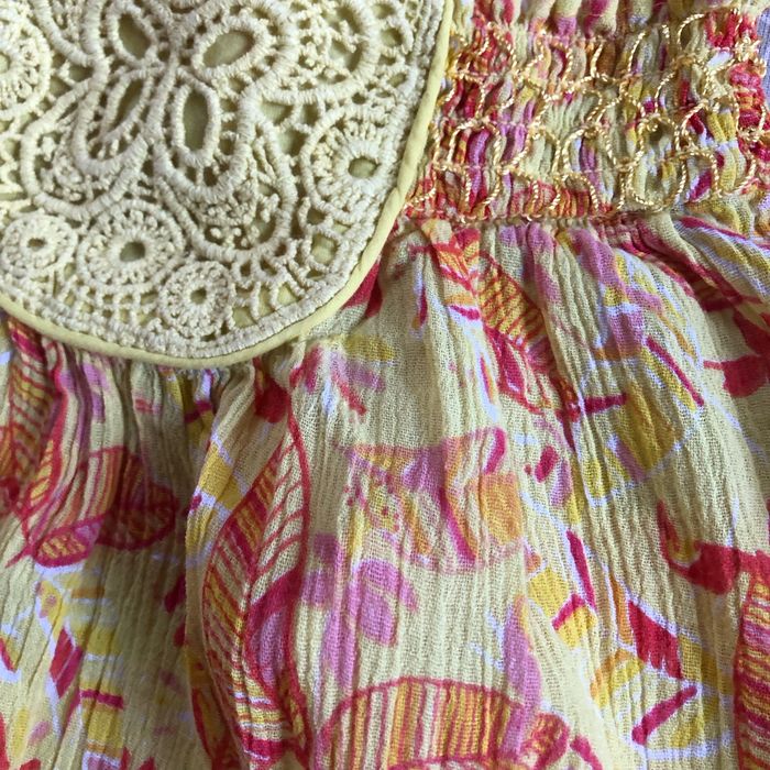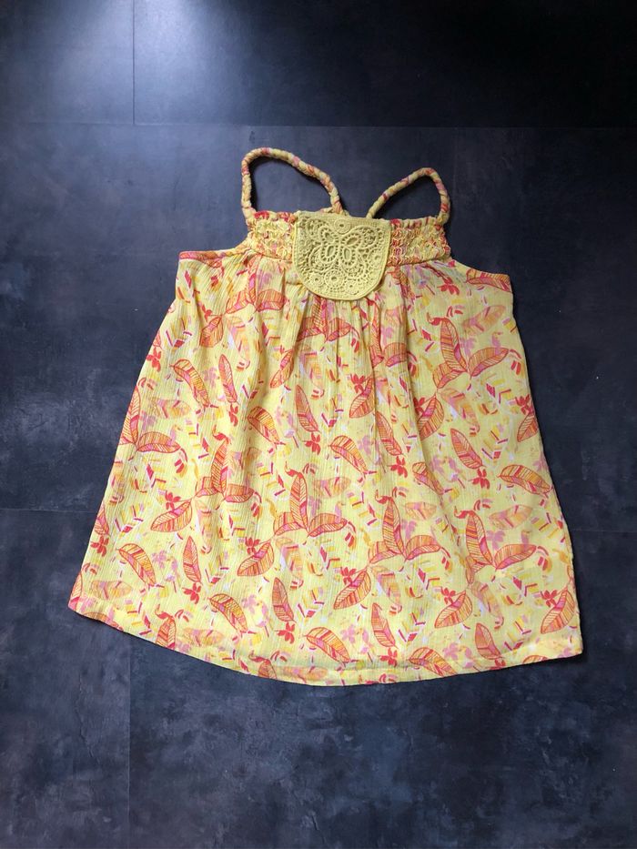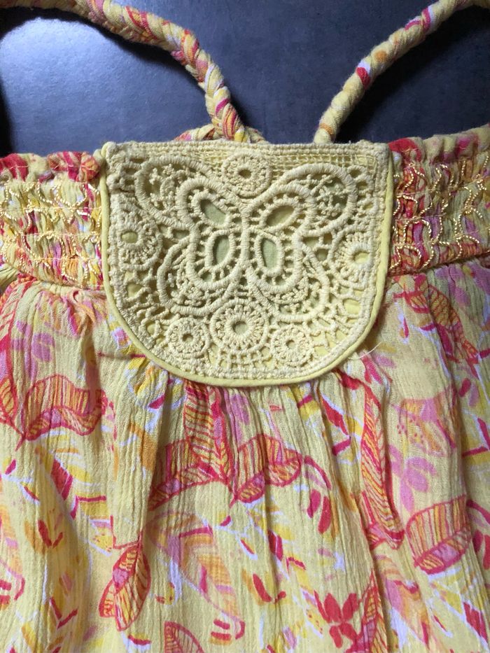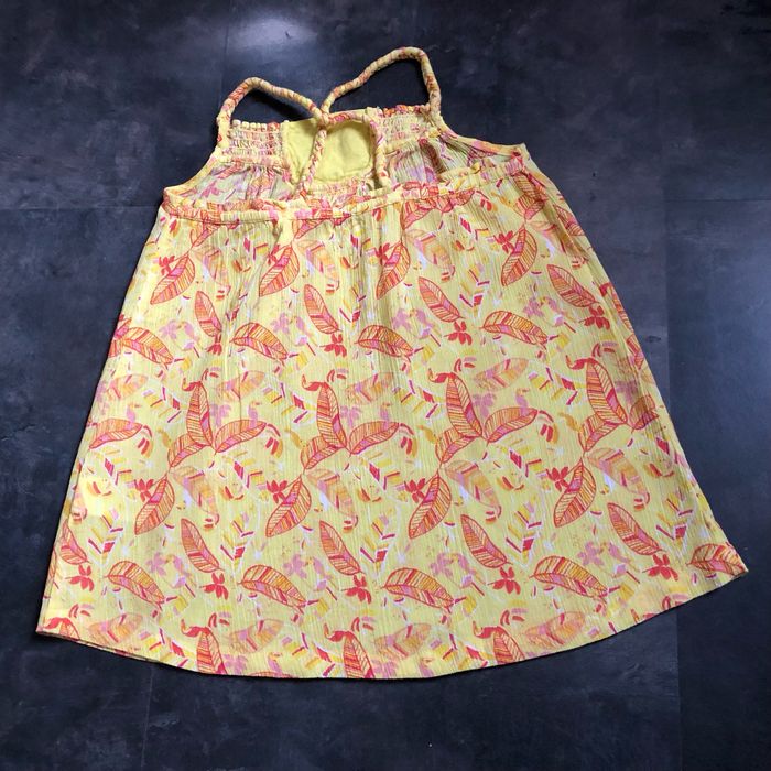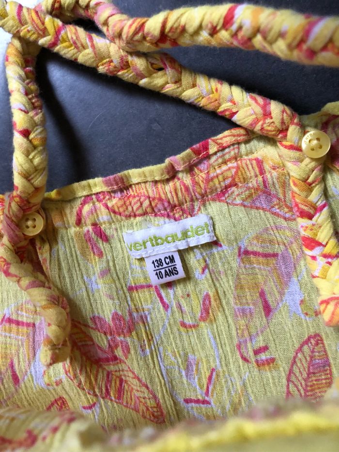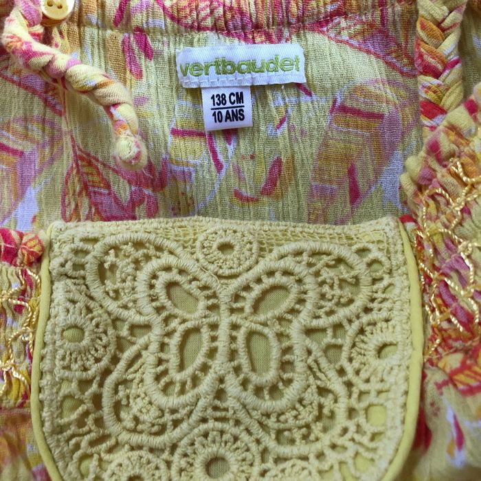 Tunique jaune imprimé plumes rouge Bretelles tresses réglables Smocks et papillon macramé en haut devant 100% coton Taille 10 ans 138 cm vert baudet