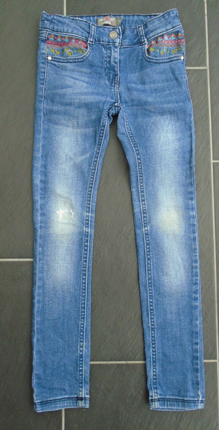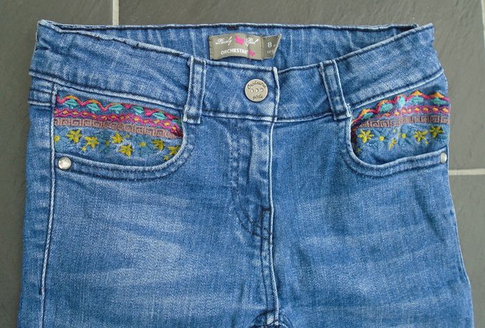 Vends ce beau jean slim pour fille de 8 ans. Très bon état : une déchirure jambe droite (raccommodée et consolidée avec bande thermocollante à l'intérieur). Très joli décor coloré au niveau des poches avant et d'une poche arrière. #titiya76jeanfille8ans #titiya76fille8ans #titiya76fille #titiya768ans