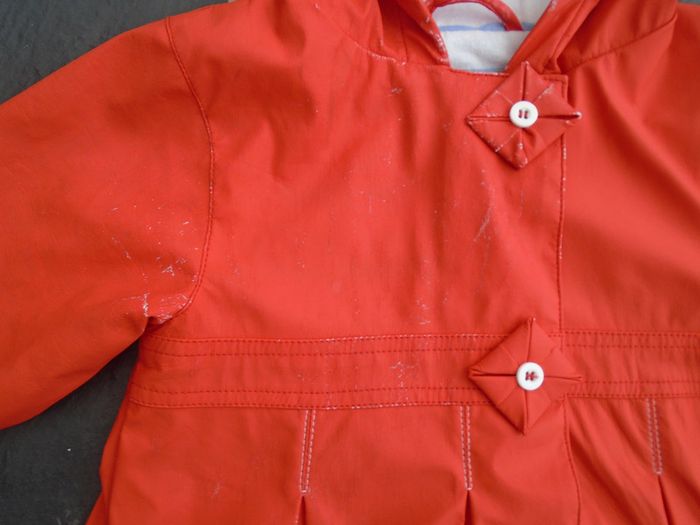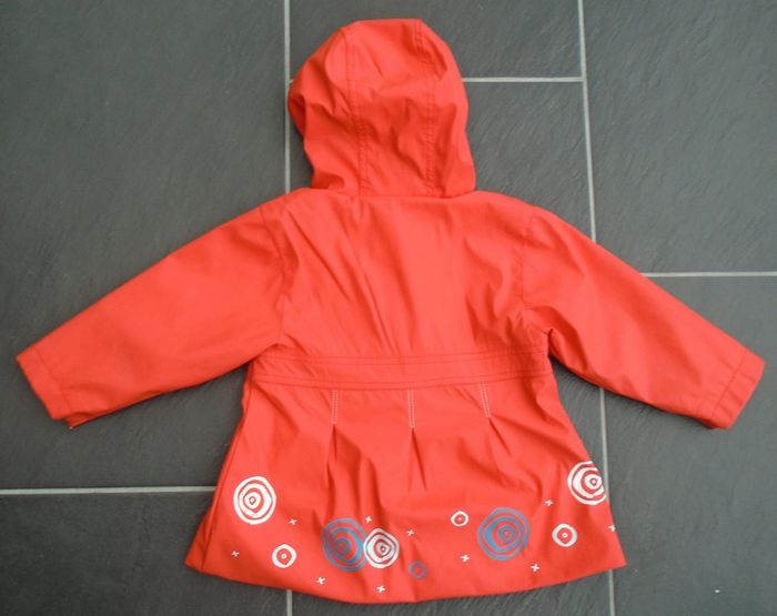 Vends ce joli imperméable pour fille de 9 mois (71 cm). Bon état. La couleur rouge part légèrement par endroits (voir photo) + un coin décoloré à l'intérieur de la capuche mas peu visible (voir photo). Aucun trou. Boutons joliment finis en relief. #titiya76impermeablefille9mois #titiya76fille9mois #titiya76fille #titiya769mois
