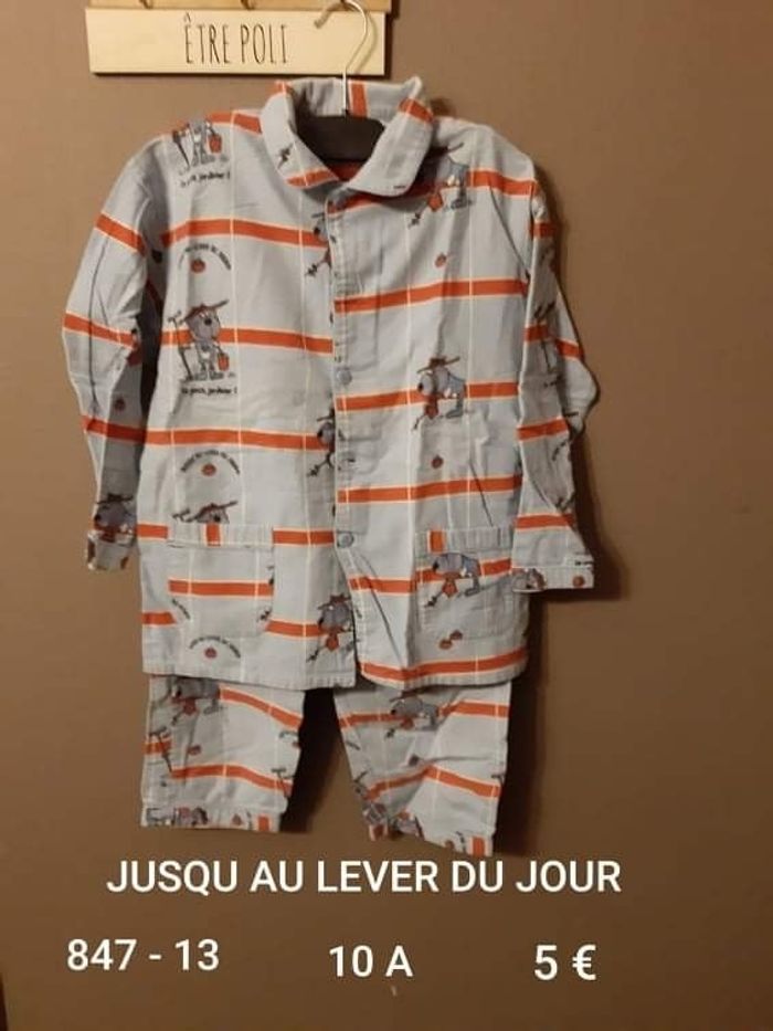 Pyjama flanelle bleu et orange Marque : jusqu au lever du jour Taille 10 ans Prix 5€ ETAT : Seconde main Mis mais je ne vois ni tâche ni trou