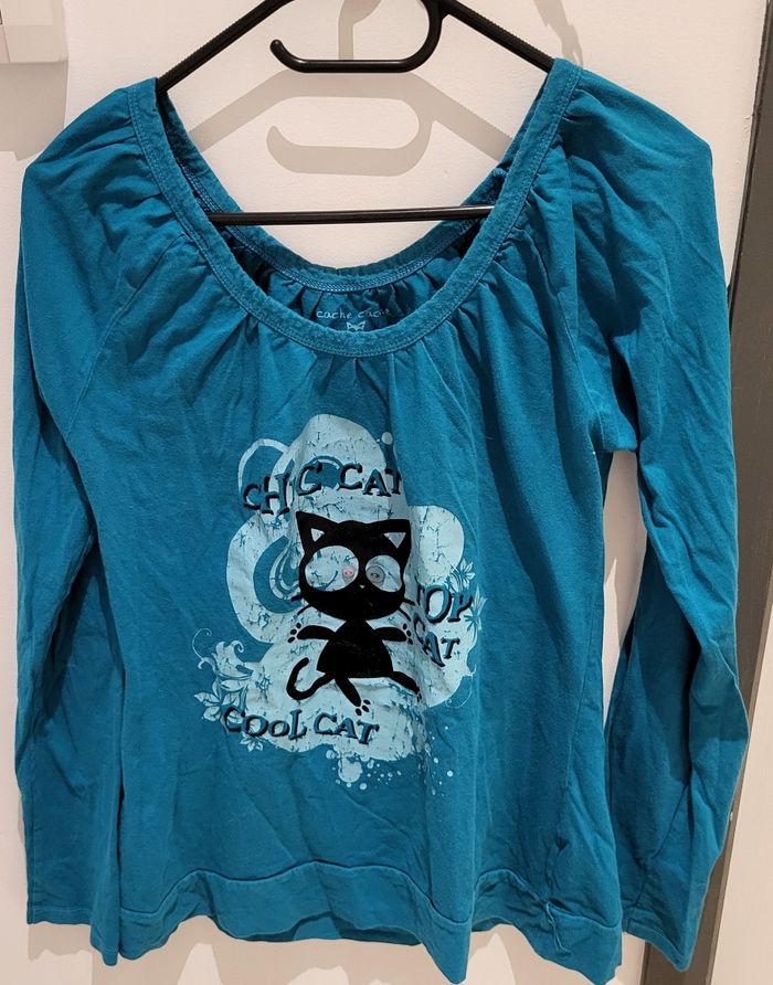 Bon état ce Tee-shirt manches longues bleu vert avec impression chat Taille 4 en 42/44 Marque cache-cache 💫 de nombreux autres articles dans mon dressing,n hésitez pas à regarder pour profiter de la réduction sur lot et des 20% sur les frais de livraison 💫