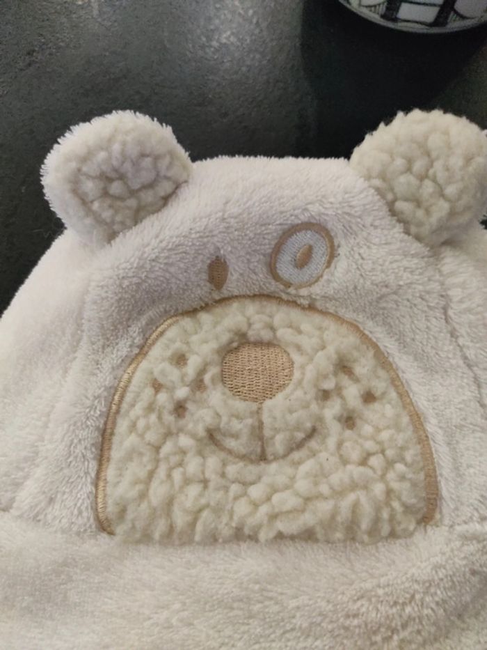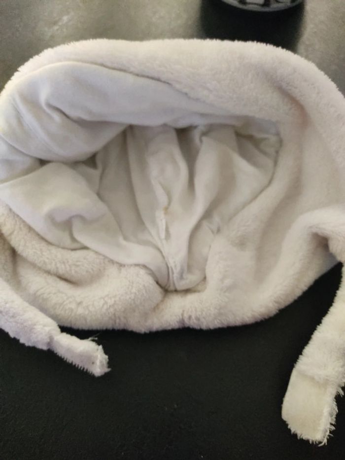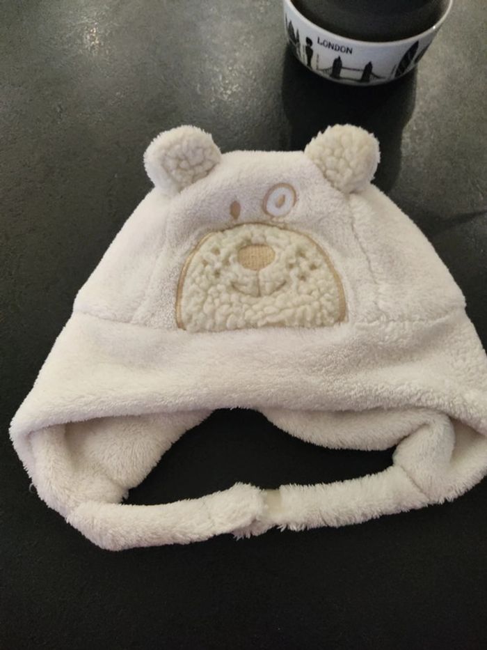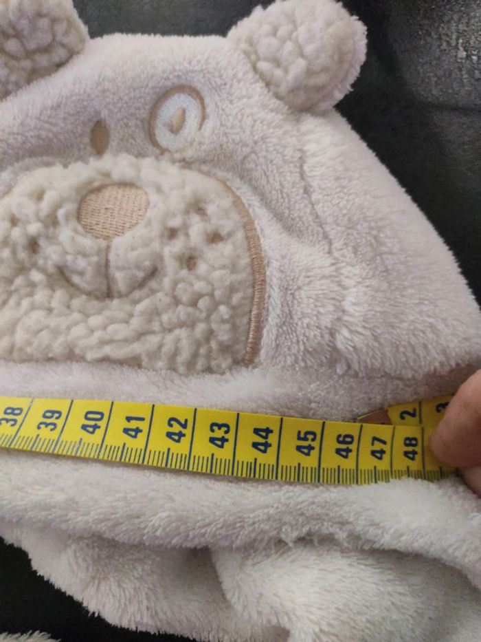 #12moispsymary15 #6moispsymary15 #18moispsymary15 Bonnet tout doux tout chaud Blanc cassé crème Je ne sais plus la marque l'étiquette a été coupée Tour de tête au ruban mètre environ 46 cm Fermeture en dessous du menton avec un scratch Très bon état