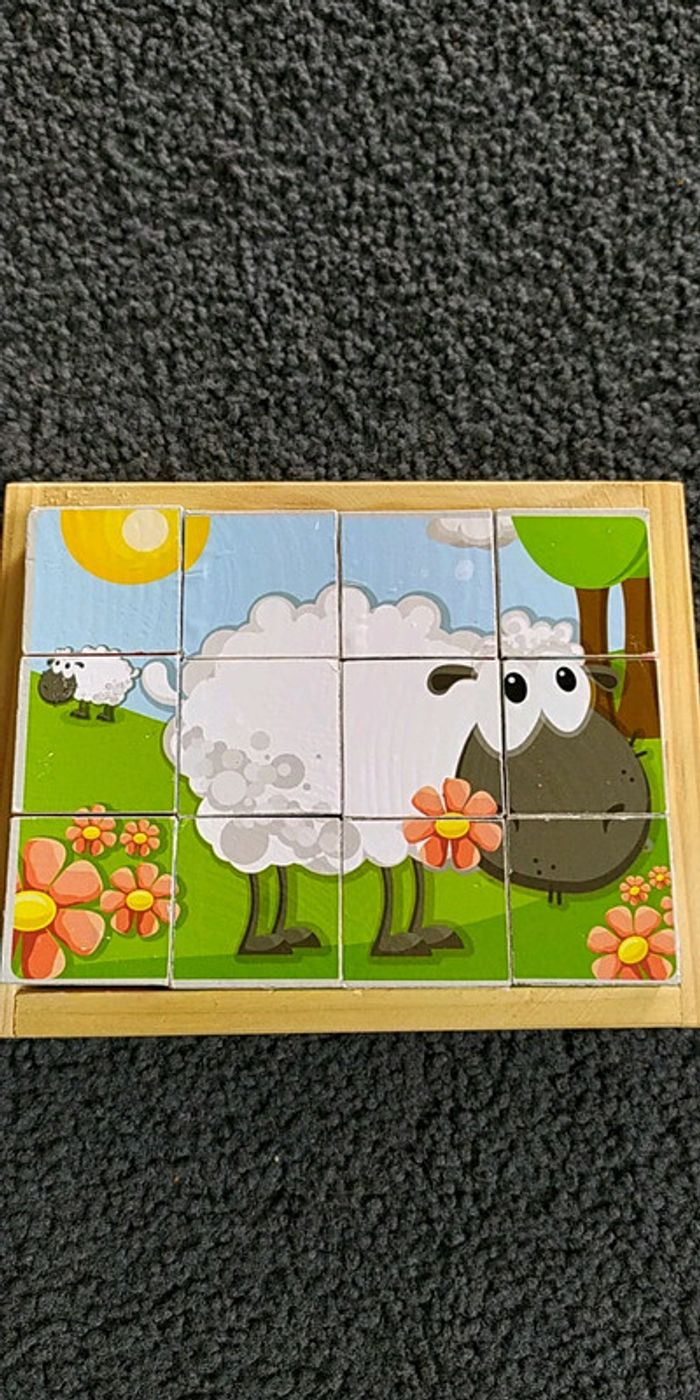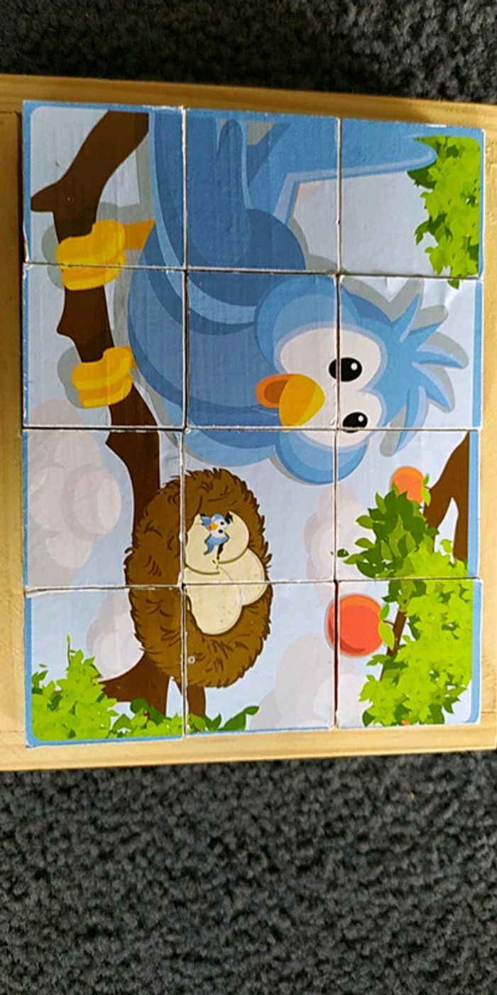 #jouetpeluchepsymary15 Puzzle animaux 4X3 cubes Dans un socle en bois mais pas de couvercle sur le dessus Possibilités de faire 6 images d'animaux Les modèles sont au dos du socle Usure sur les côtés des cubes cf les photos Très bien pour développer les fonctions motrices