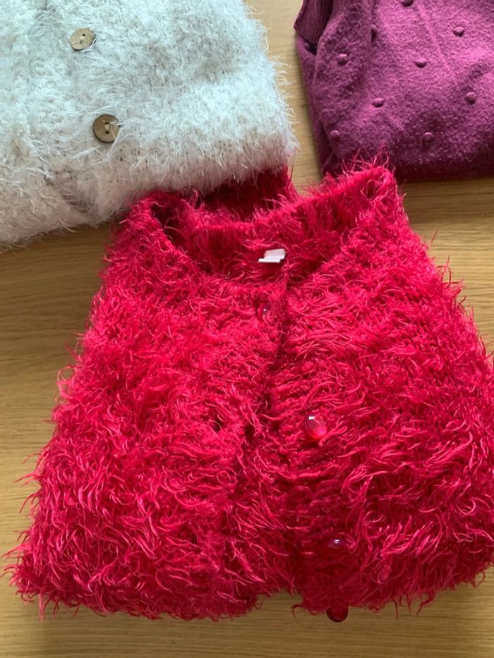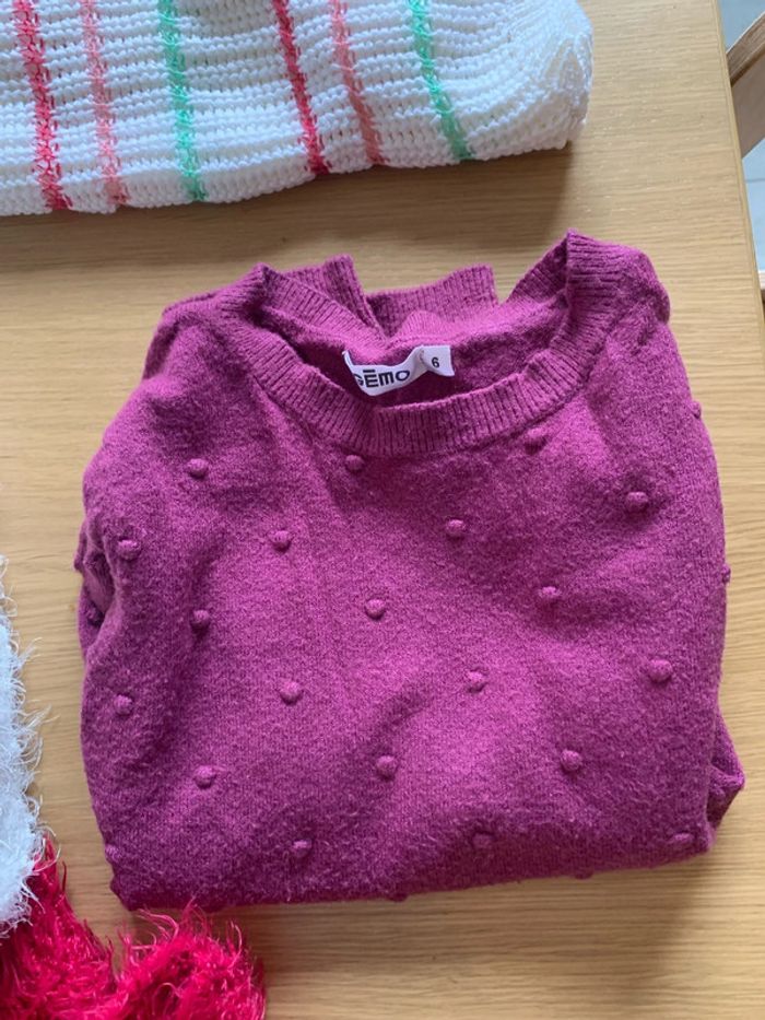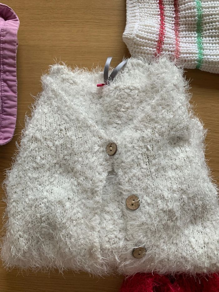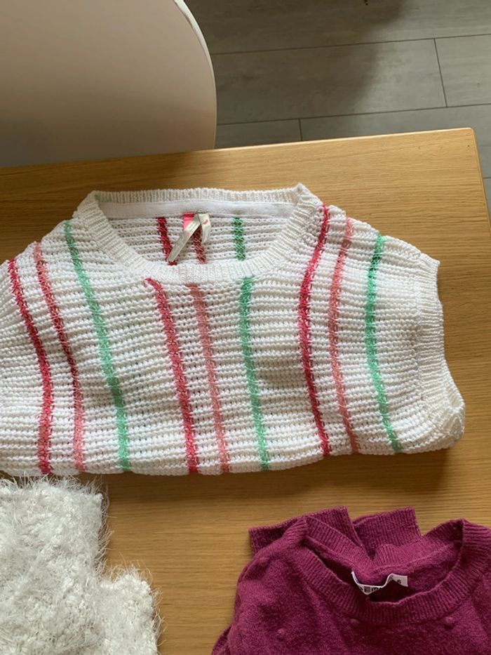 Marques Orchestra, Gemo 1 pull blanc rayé sans manche 1 gilet blanc 1 gilet rose 1 pull violet